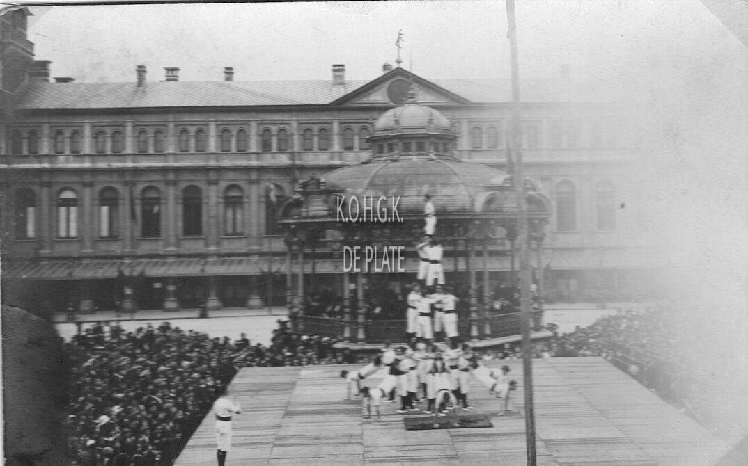 Formaat : 8,5 x 13,5 cm. - Met muziekkapel op de kiosk. Op de achtergrond, het Stadhuis. - Map foto's 08c