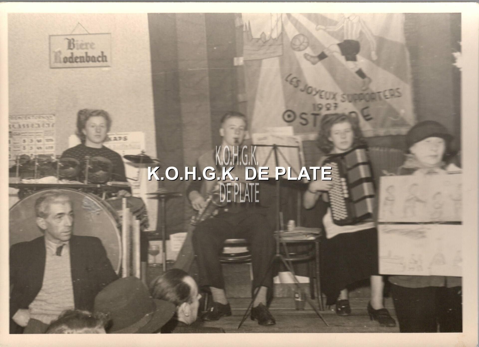 Formaat : 13 x 18 cm.- Feest bij KVGO voetbal supportersclub "Les Joyeux Supporters". Hun vlag op de achtergrond. De supportersclub werd gesticht in 1927 in "Hôtel des Nations et de Charleroi", in de Langestraat.