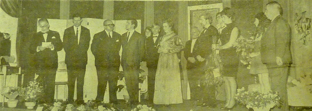 Foto : Viering van mevrouw Simone Candaele voor 35 jaar toneel. Octaaf Defoor houdt een toespraak. Ook aanwezig Raymond Miroir, schepen en Fritz Content, voorzitter van het Conservatoriumtoneel. (Photo André)