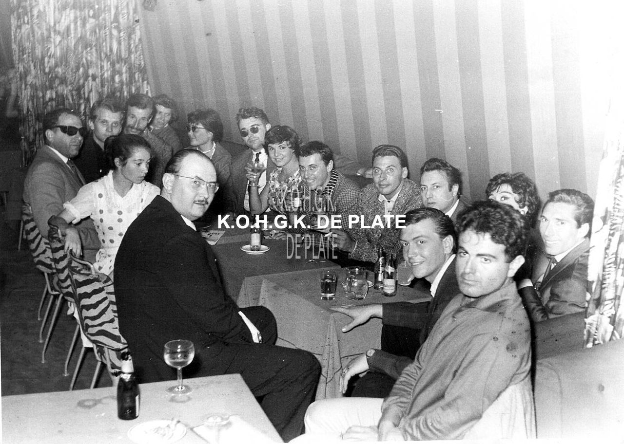 Formaat : 13 x 18 cm. - Met Catherine Sauvage, Guy Béart, Raymond Devos, Erik Montry, Lafleur, Nadine Claire, Rosita, Les Cinq Pères. "Le Théâtre des Trois Baudets", gelegen in Pigalle (Parijs). Gecreëerd op het einde van de jaren veertig door Jacques Canetti om jonge artisten een kans te geven. Zij traden op in de concertzaal. Hier in de nightclub "La Champagne", met vooraan links, Roger De Ramée, directeur van het Kursaal en onder voorbehoud, naast hem Catherine Sauvage. Vooraan, Guy Bejart. Op de achterste rij, derde van rechts, Raymond Devos