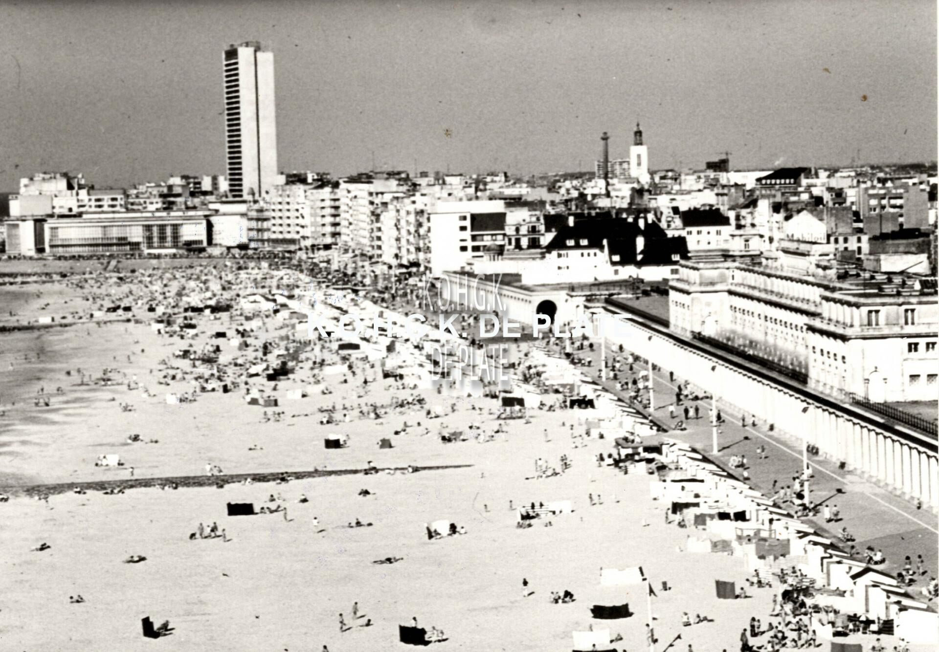 Formaat : 9 x 12,5 cm. - Strandrecreatie op het Groot Strand. Rechts, de Koninklijke Gaanderijen en het Thermae Palace Hotel. Wat verder, de Nieuwe Gaanderijen en de Koninklijke Villa. De woontoren "Europacentrum" in de Van Iseghemlaan. Links, de westgevel van het vierde Kursaal