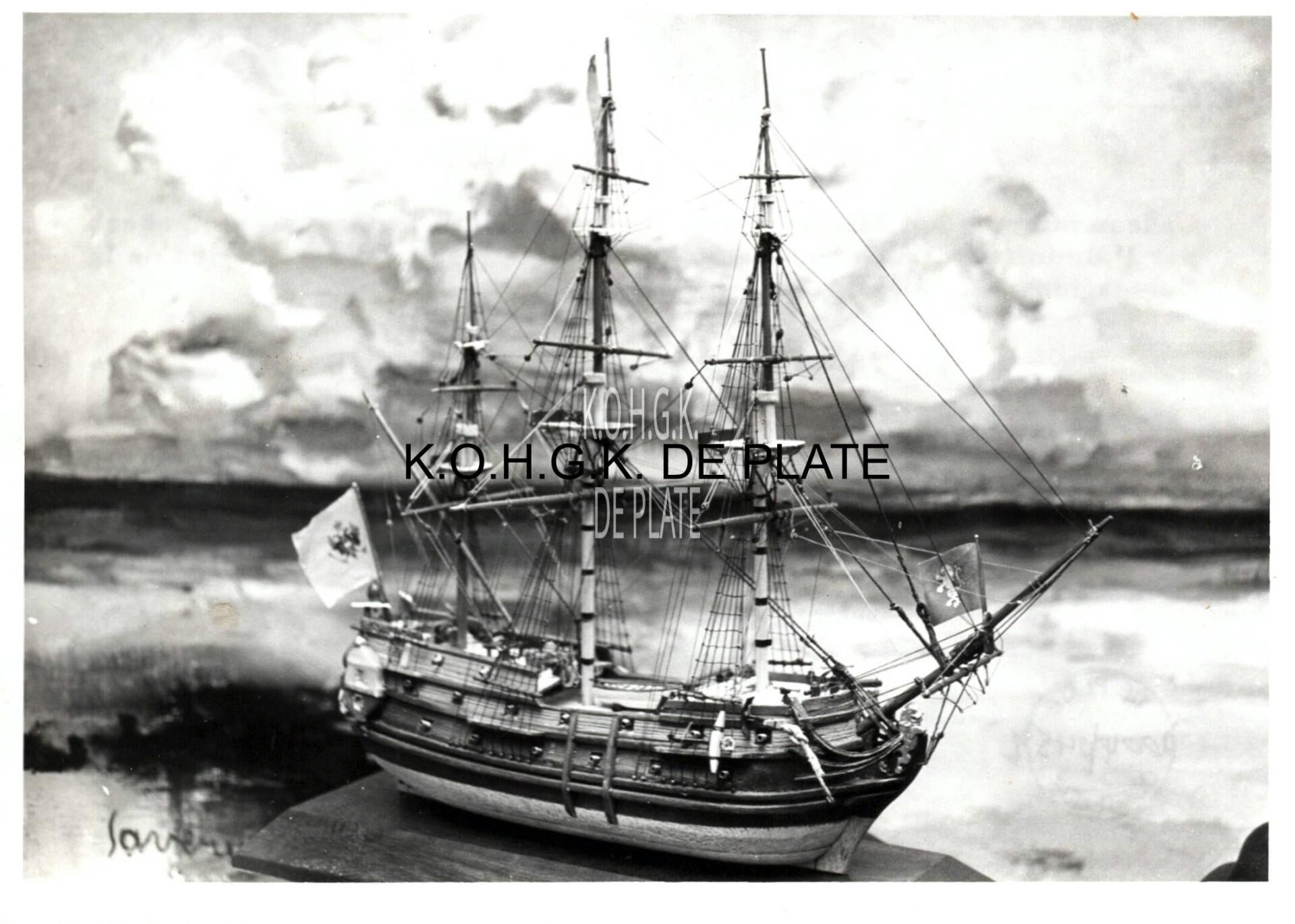 Formaat : 13 x 18 cm. - Tekst op keerzijde : Cadeau offert à son Altesse Sérinissime le Prince Rainier III de Monaco par l'Administration Communale d'Ostende. Maquette d'un navire de la Compagnie Ostendaise. Geschenk aangeboden door de Oostendse delegatie naar aanleiding van de Jumelagefeesten te Monaco op 25 januari 1964.
