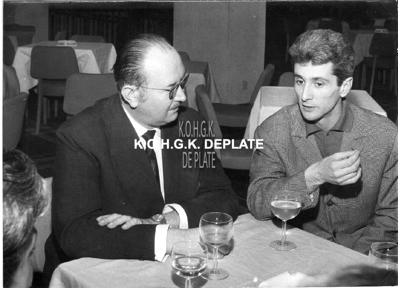 Formaat : 13 x 18 cm. - Marcel Amont in gesprek met Roger De Ramée, directeur van de Kursaal.
