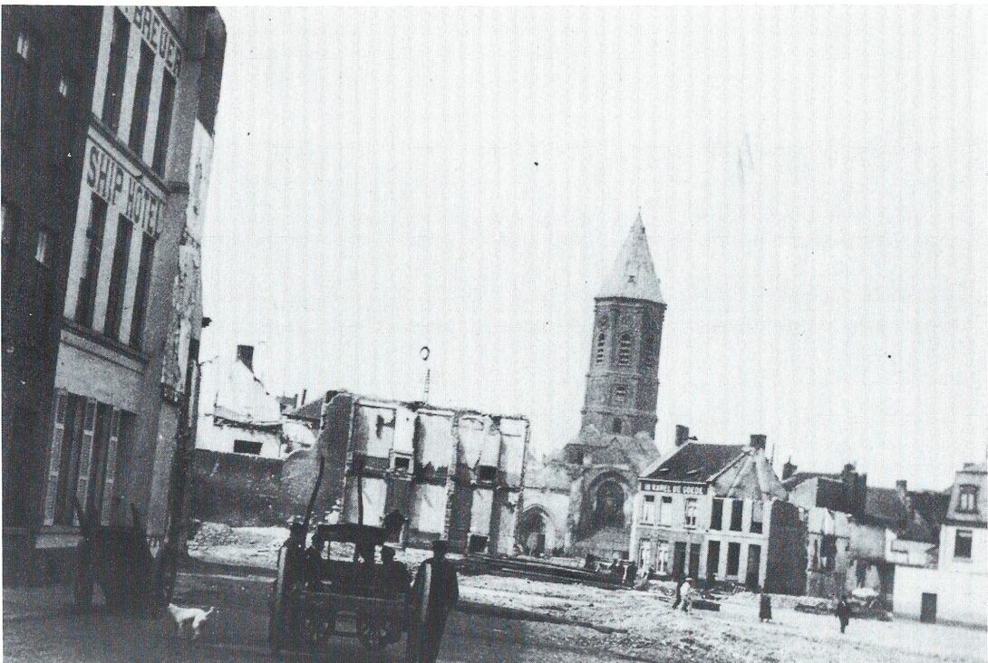 Foto : Mei (1899). - De afbraak van de huizenrij aan de Square Baudouin, links het Ship hotel, op de achtergrond de toren (Peperbusse) van de vernielde Sint Pieterskerk
