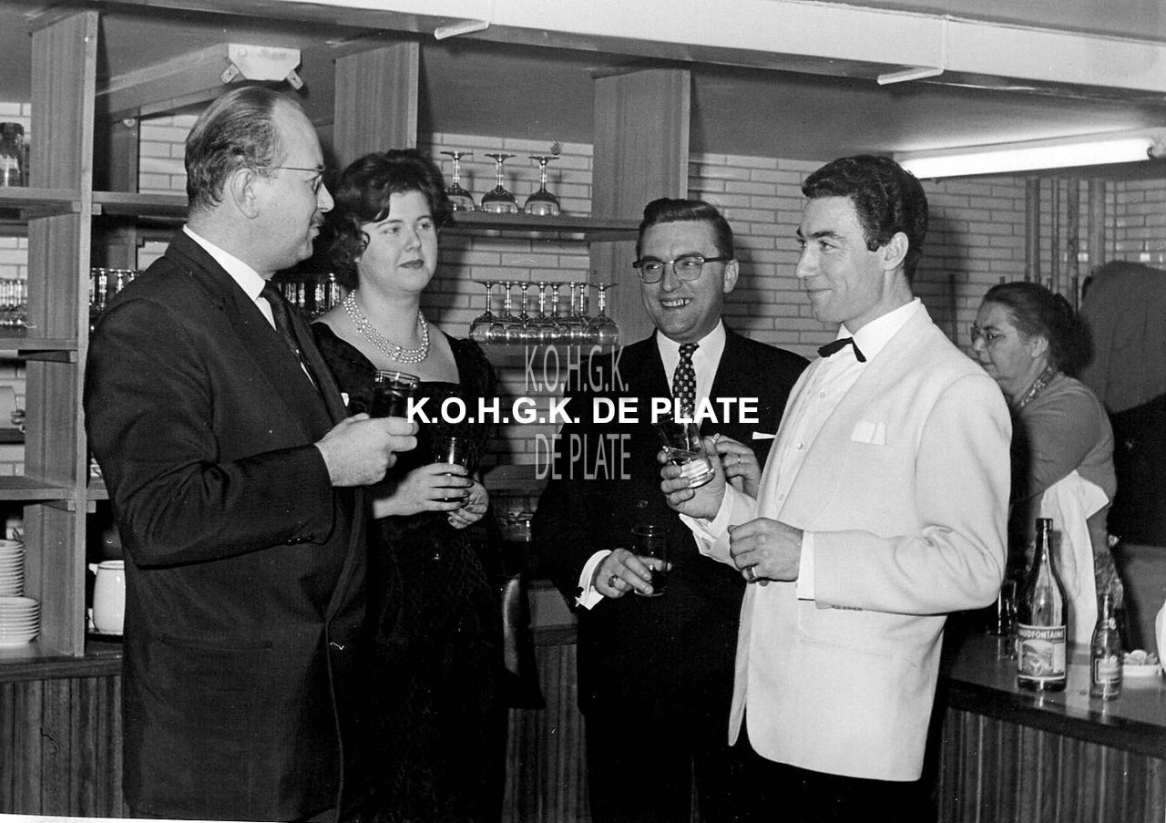 Formaat : 13 x 18 cm. - Merino Costa trad op in de nightclub "La Champagne". Hier Merino Costa (rechts) in gezelschap van o.a. Roger De Ramée, directeur van het Kursaal (links)