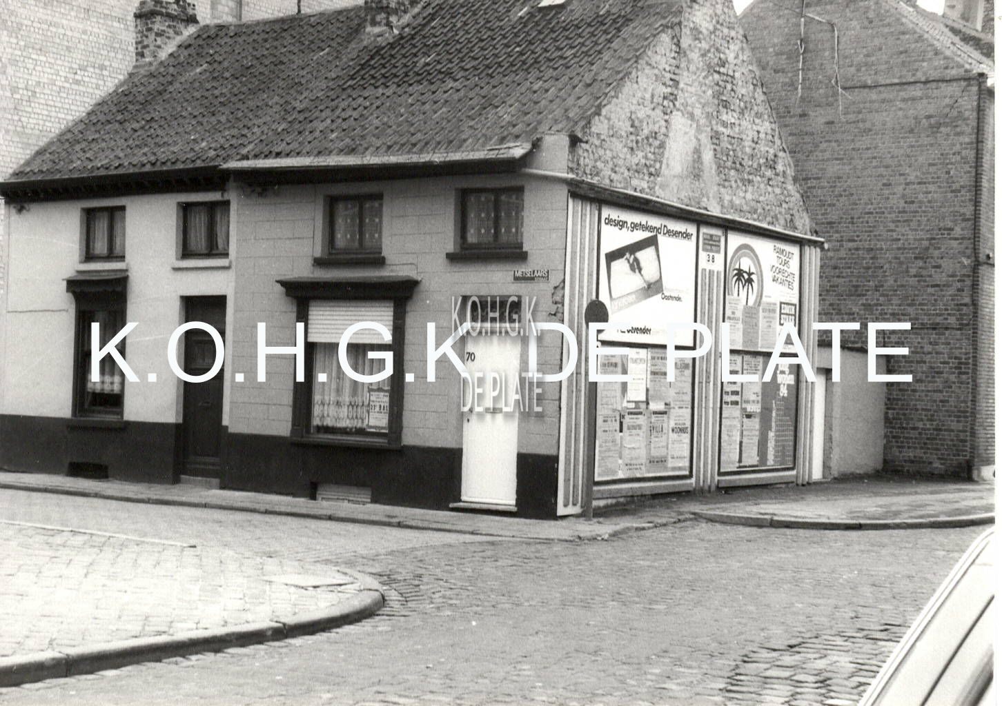 Formaat : 8 x 12,5 cm. - Hoek Metselaarsstraat-Timmermansstraat. Vermoedelijk het restant van een langere rij arbeiderswoningen uit eind 19de eeuw. Op de zijmuur van nr. 70 zien we 4 reclamepanelen