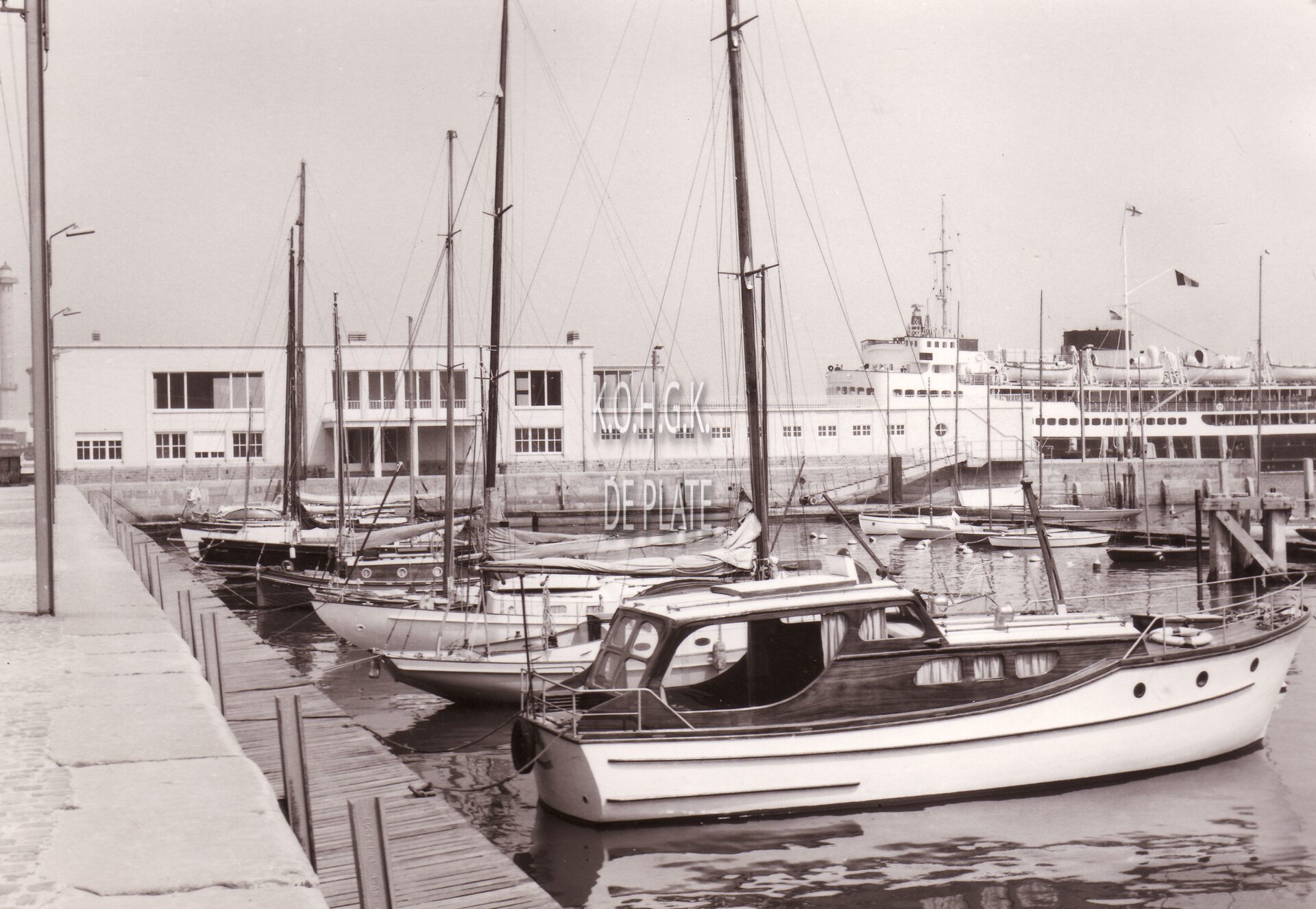Formaat : 13 x 18 cm. - Een carferry vaart de haven uit en passeert het gloednieuwe gebouw van de North Sea Yacht Club. Enkele jachten in het Montgomerydok.