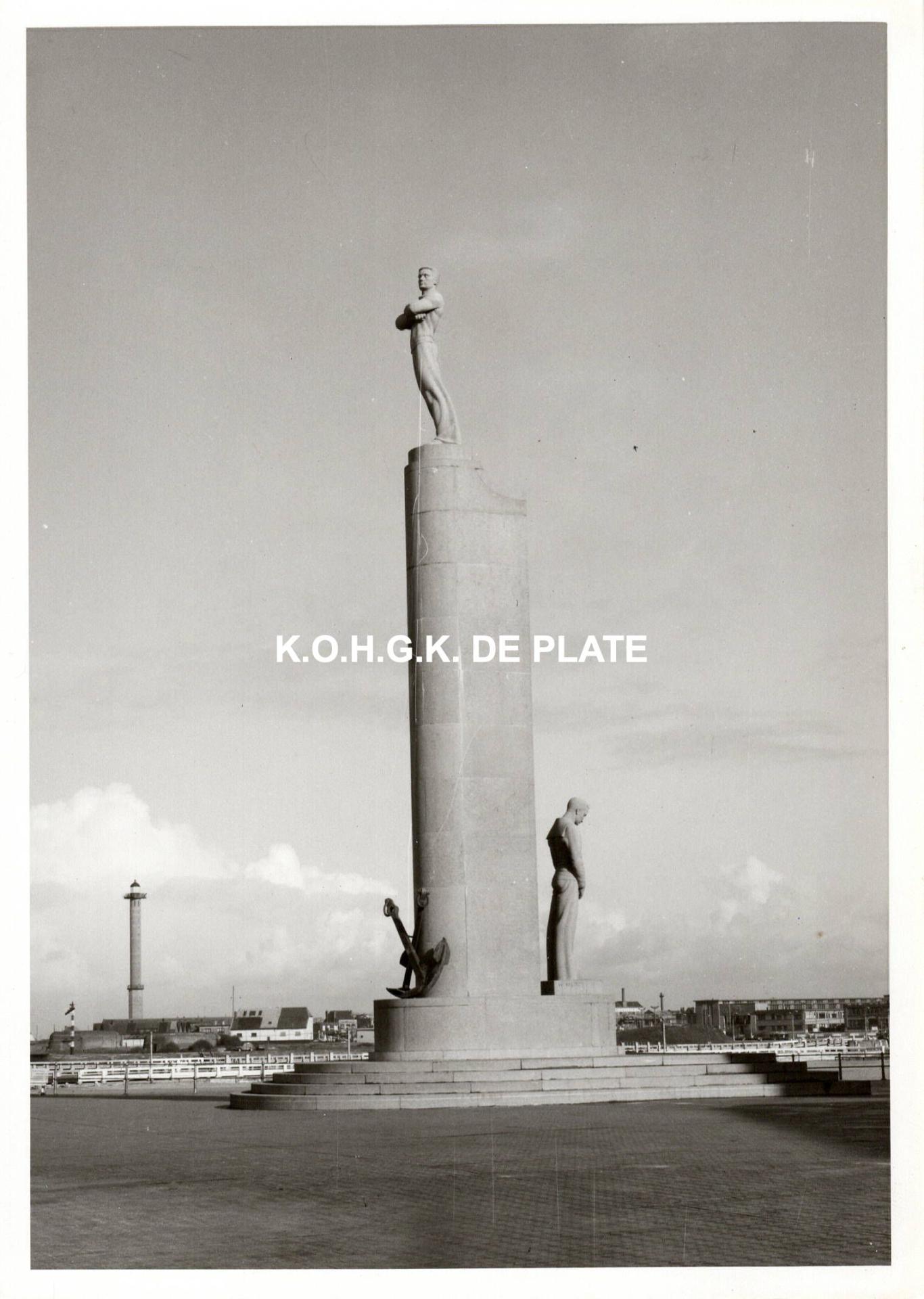 Formaat : 18 x 13 cm. - Het Monument deer Zeelieden, op het Zeeheldenplein, kort na de afwerking ervan. Links, op de oosteroever, de vierde vuurtoren "Lange Nelle"