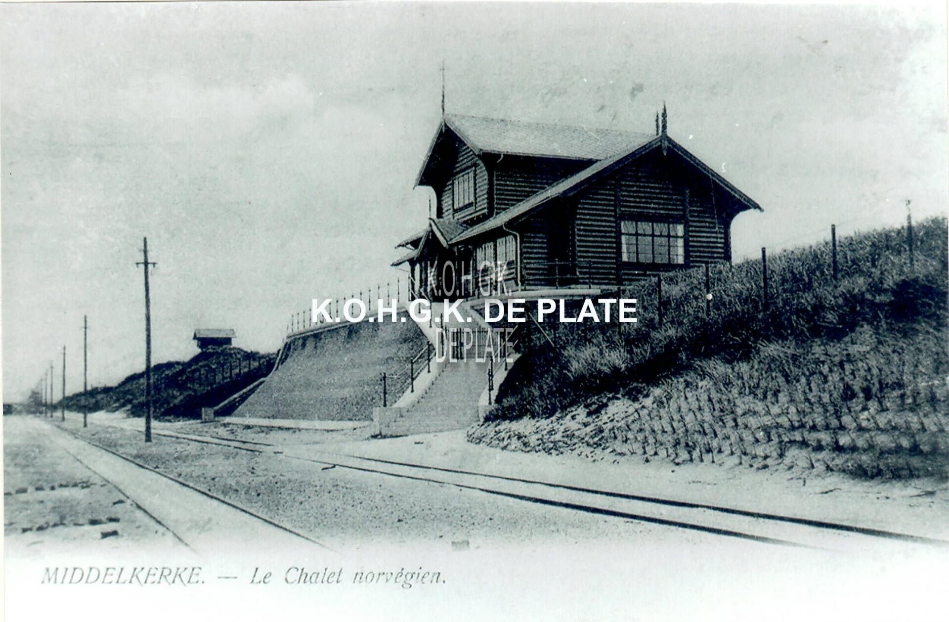 Formaat : 13 x 18 cm. - Het Koninklijk Chalet en wat verder het tuinpaviljoentje langs de Zeedijk (Raversijde), gebouwd naar de plannen van de Noorse architect Knudsen. In 1897 rijdt voor het eerst de tram op de wandeldijk, of geëffende duinen tussen Oostende en Middelkerke. Dit dubbel tramspoor wordt uitgebaat door de "Compagnie du Tramway éléctrique d'Ostende-Littoral", vanaf december 1904 door de NMVB.