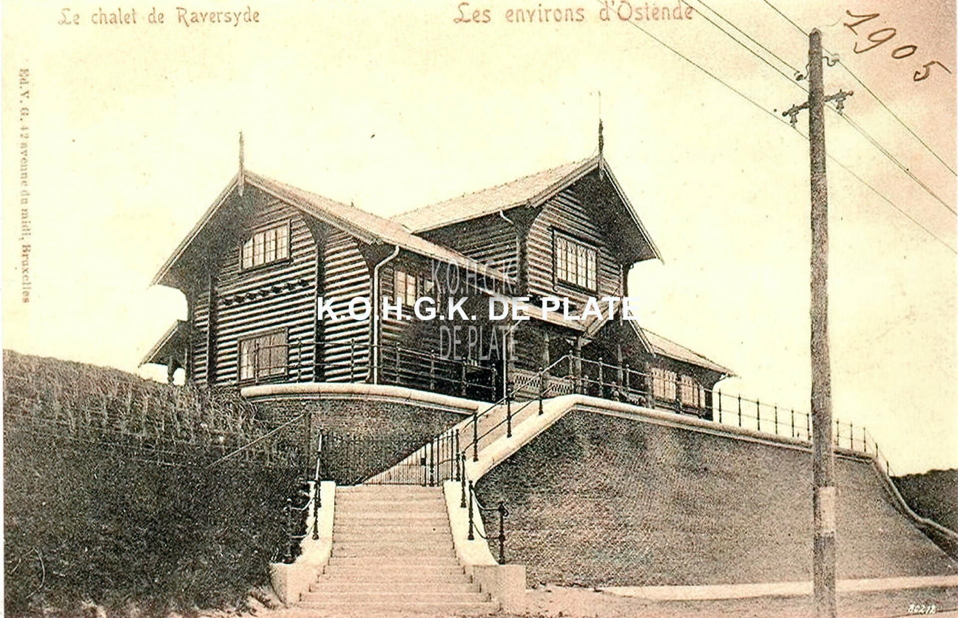 Formaat : 13 x 18 cm. - Houten constructie in Scandinavische Jugendstil, opgericht in 1904 naar de plannen van de Noorse architect Ivar Andreas Knudsen. Het Chalet, gelegen langs de Zeedijk (Raversijde), rust op een bakstenen onderbouw. Twee zijdelingse brede trappen geven toegang tot het Chalet. Door de Duitse bezetter in december 1914 in brand gestoken, omdat het een herkenningspunt zou betekenen voor de Britse Marine. In januari 1915 wordt een van de kanonnen van de batterij Aachen op deze plaats ingebouwd. Sporen van de arduinen onderbouw bestaan nog steeds.