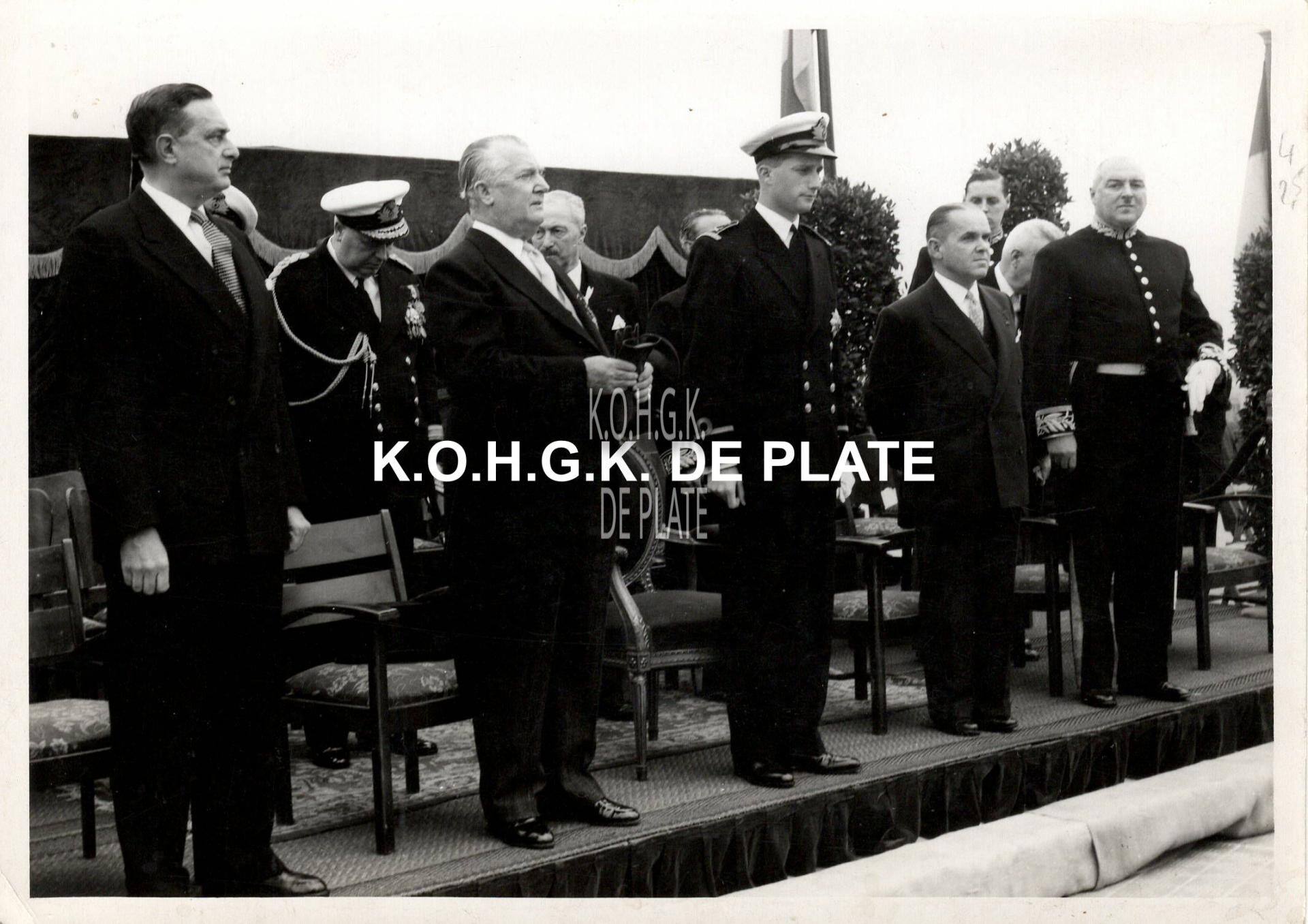 Formaat : 13 x 18 cm. - Inhuldiging van het "Nationaal Monument voor de Zeelieden" in aanwezigheid van prins Albert. Naast de prins, links, Lucien Decrop, de promotor van het monument. We herkennen ook : o.a. rechts, schepen Maurice Quaghebeur sr. en naast hem burgemeester Adolf Van Glabbeke. Achter hem een glimp van schepen Jan Piers.