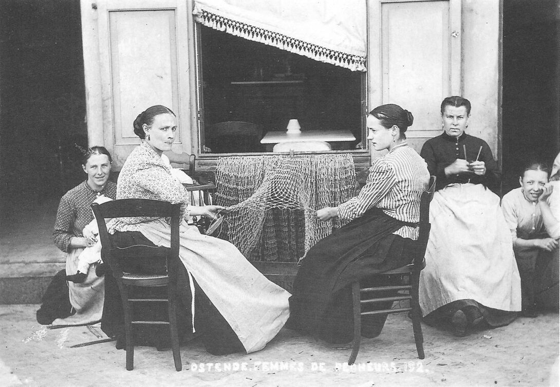 Omschrijving Sfeervol beeld van vissersvrouwen die visnetten breien. Trefwoorden NETTENBREISTERS VISSERSGEMEENSCHAP BREIEN VAN VISNETTEN Plaatskenmerk B467 Deelbeschrijving uit boek of document Oud Oostende in beeld 3 1987 Auteurs Van Caillie André Pagina 79 Print