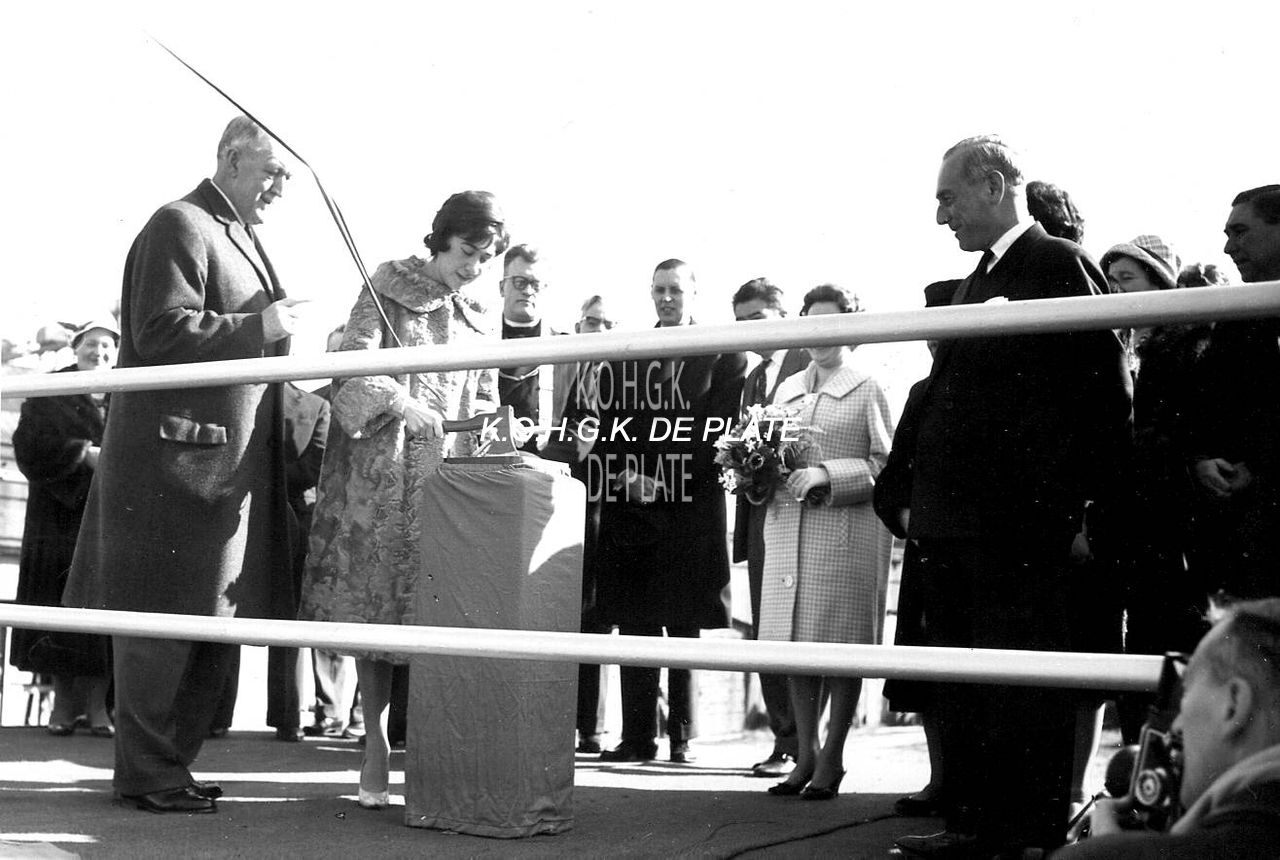 Map 2009/0842-2. - Mejuffrouw Jeanine Lambregt hakt het vaartuig los. Op de achtergrond zien we E.H. Daniël Van Parijs met naast hem burgemeester Jan Piers