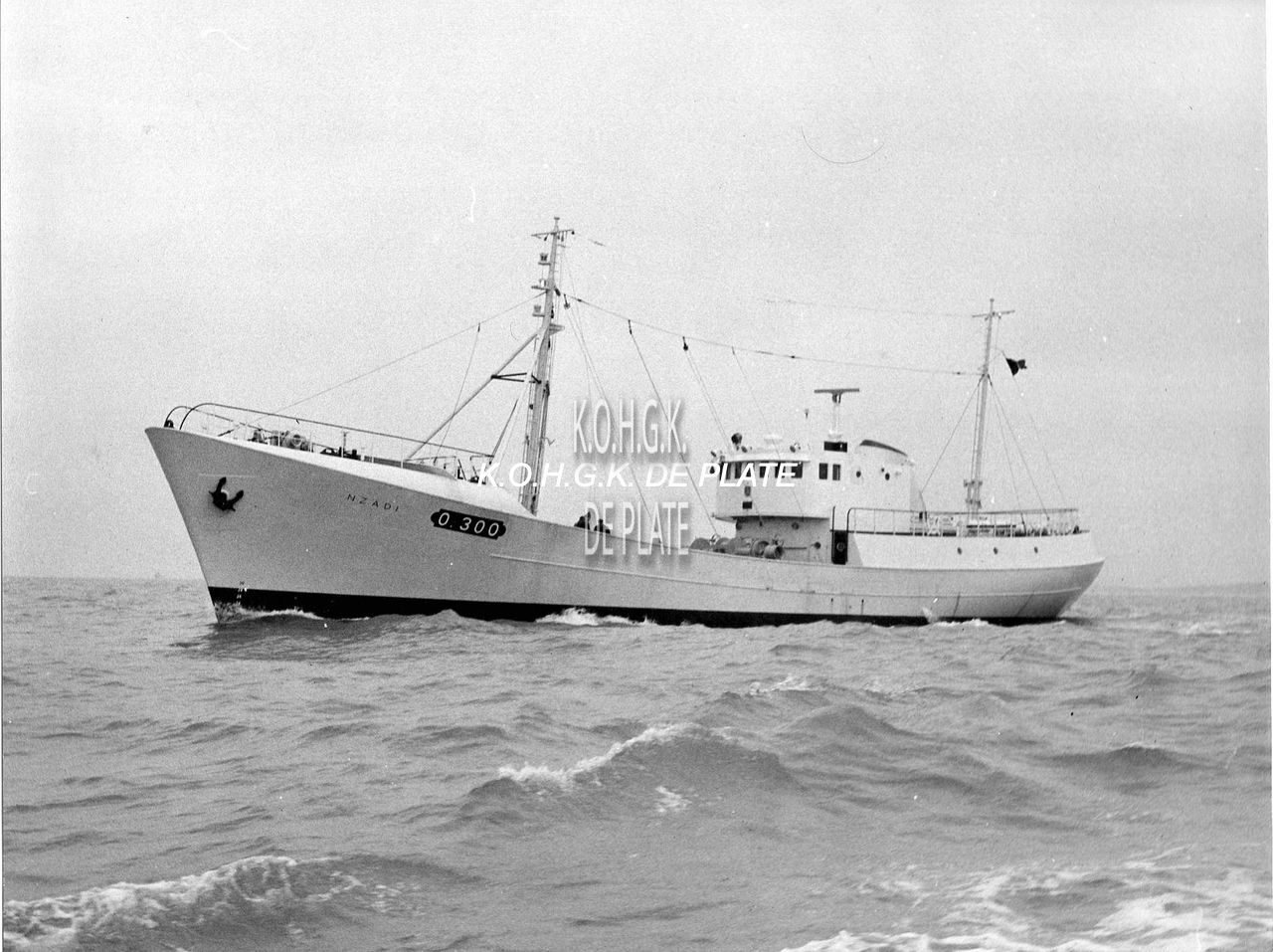 De O.300 "Nzadi", gebouwd te Oostende in 1969 op de scheepswerf Béliard-Murdoch voor rekening van de rederij Armement et Pêche Maritime s.a. Stalen motortreiler met een bruto tonnemaat van 316,99 en een netto tonnemaat van 108,83. Voorzien van de motor Deutz (nr. 4617077) van 1000 pk (bouwjaar 1968). - Map 2009/0845-24