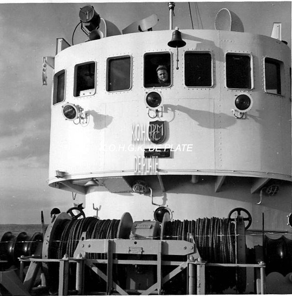 Map 2009/0840-53. - Zicht op de buitenbrug mid-ships. De drie lampen dienen voor de dek verlichting. Daarboven hangt de scheepsbel. Boven op het dak van de brug, van links naar rechts, zien we het zoeklicht, de radarantenne, een mastje met navigatielicht (Ik denk Groen/Wit voor trailervisser). De witte pijpen achteraan zijn ventilatiepijpen (Zwanenhals). Onder de brug, de vis-lier stuur en bakboord.