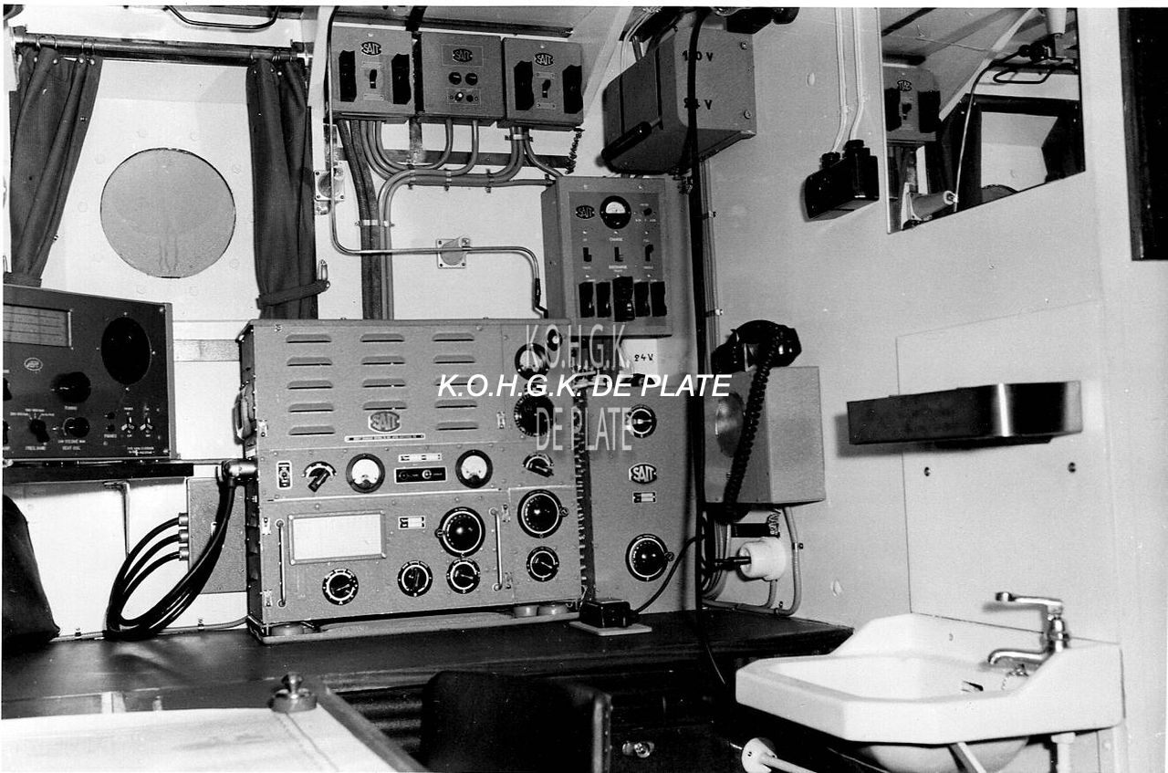 Map 2009/0840-8. - Zicht in de radiohut. Rechts zien we de hoorn voor de radiotelefonie en het zwarte bakje op de tafel is de morsesleutel voor de radiotelegrafie. Boven tegen de rechtse wand zien we de omschakelaar van 110 volt naar de noodvoeding 24 volt.
