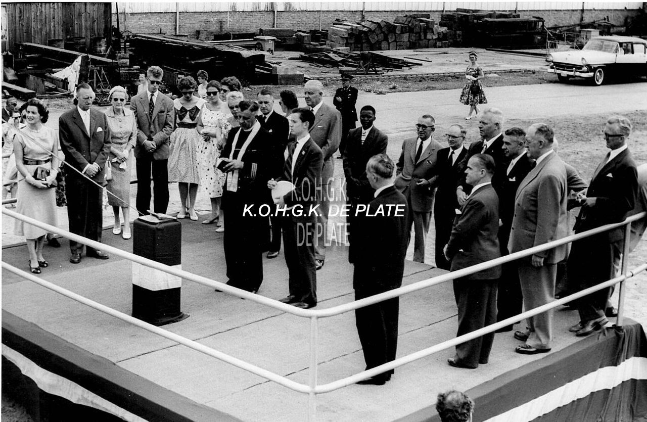 Aalmoezenier E.H. Evrard zegent het nieuwe schip. Vooraan, tweede van links, burgemeester Adolphe Van Glabbeke. - Map 2009/0840-22