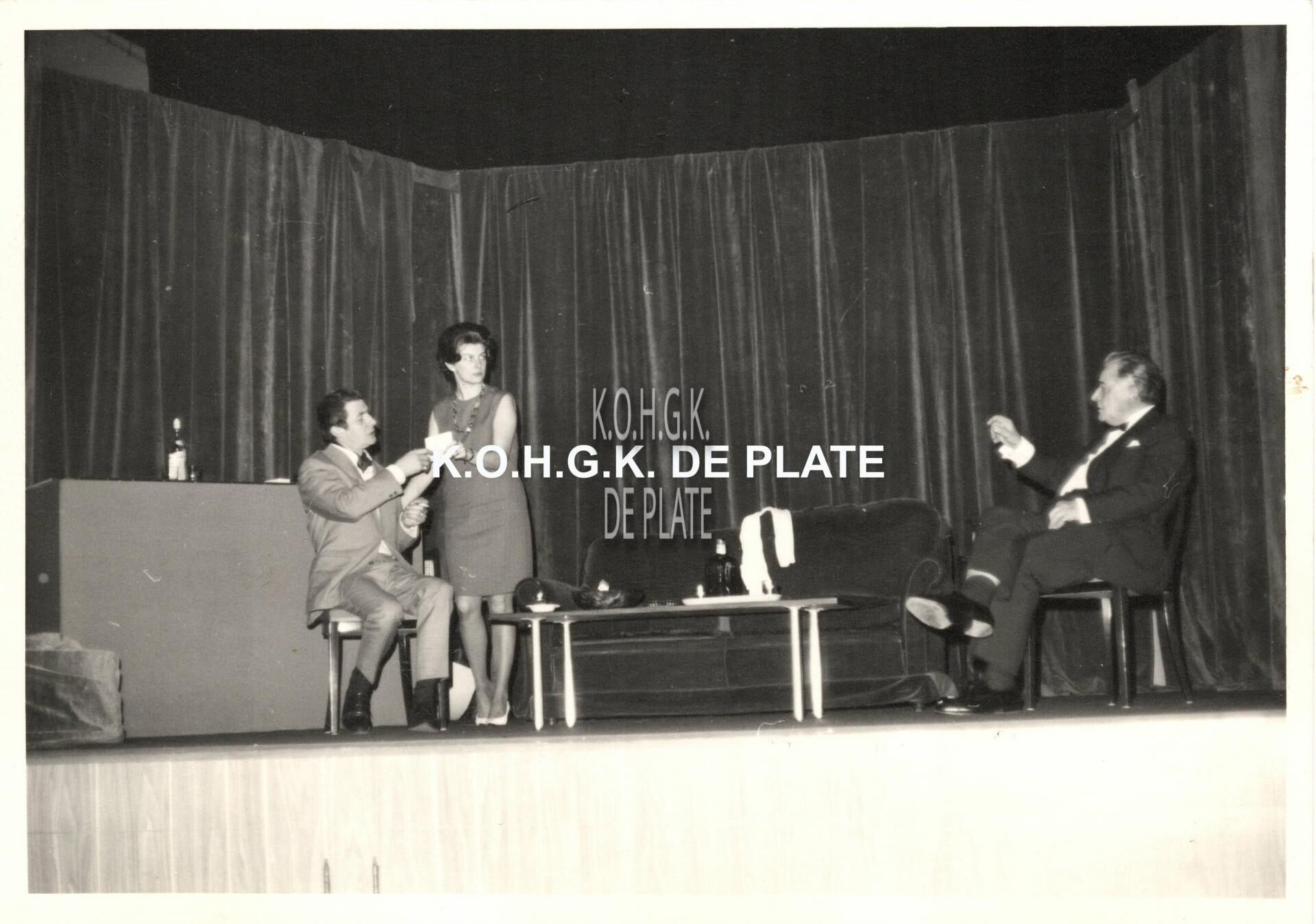 Formaat : 8,5 X 12 cm. - Conservatoriumtoneel als laureaat met éénakter "De 50ste voorstelling" te Mechelen in 1969. We zien hier Michiel Van der Straeten, Viviane Bruneel en Octaaf Defoor,