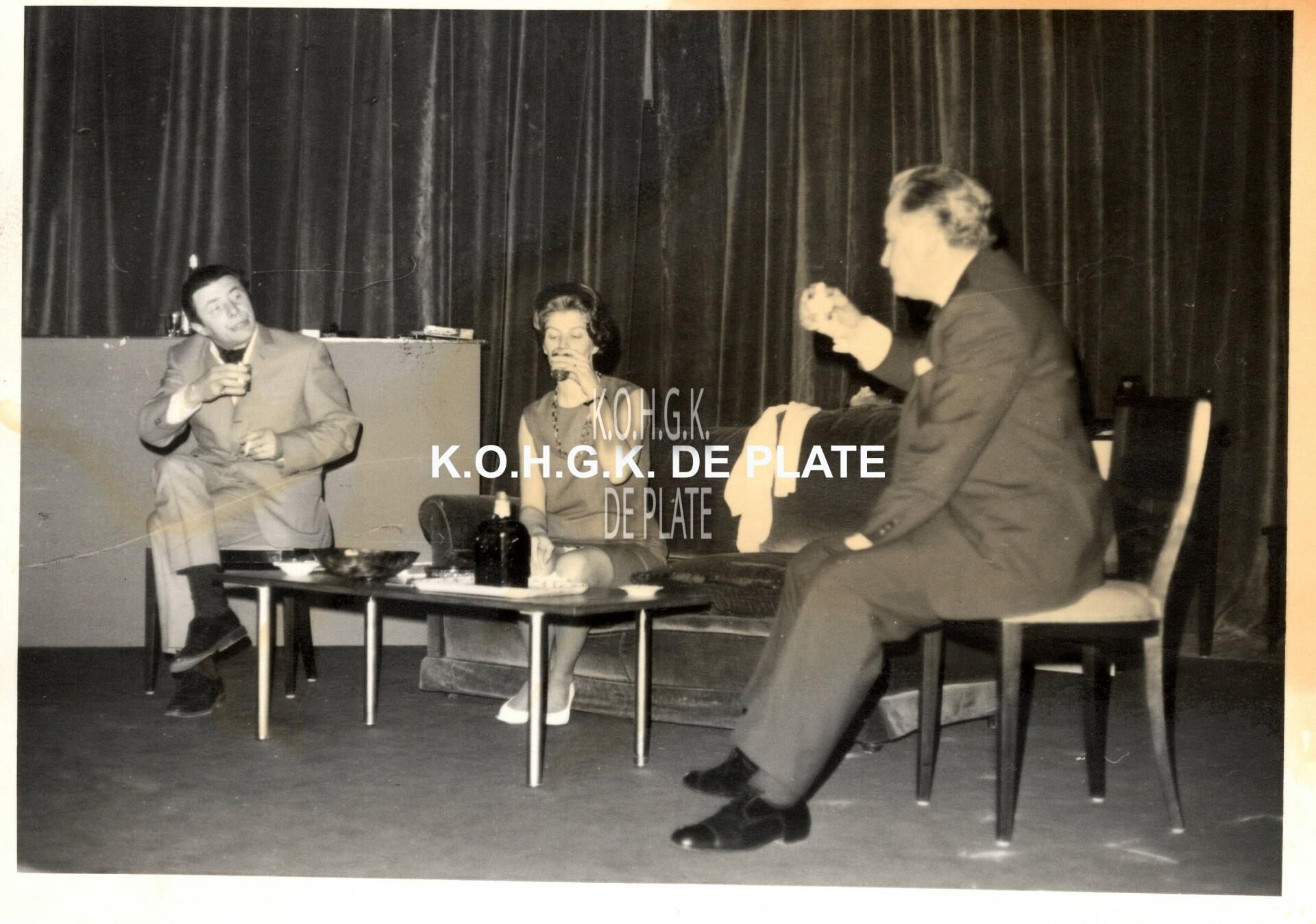 Formaat : 8,5 X 12 cm. - Conservatoriumtoneel als laureaat met éénakter "De 50ste voorstelling" te Mechelen in 1969. We zien hier Michiel Van der Straeten, Viviane Bruneel en Octaaf Defoor,