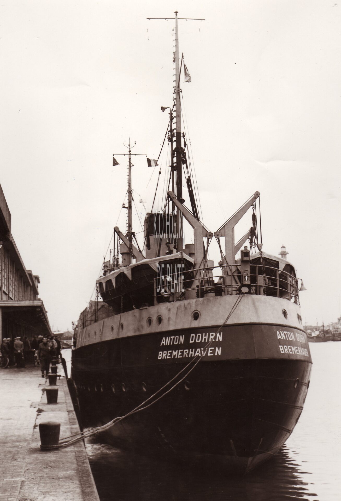 Formaat : 18 x 13 cm. - Het Duitse onderzoeksschip Anton Dohrn, op officieel bezoek, in het Visserijdok bij de Vismijn. Het bevel werd gevoerd door kapitein Ernst Vogel. De bemanning werd ontvangen op het stadhuis (Gerechtshof) door schepenen Jan Piers en Kamiel Dehouck.