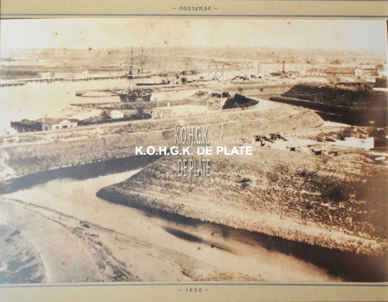 Zicht van de oostelijke vestingen, met rechts van de gracht het "Bastion" met kanonnen en links ervan de dijk. Achter de dijk ligt de oesterput van Musin. Het gebouw met plat dak, centraal. Een zeilschip ligt op de kuisbank. Langs de Quai aux Bateaux à Vapeur, de landtong naast de kuisbank, liggen enkele kleine pakketboten gemeerd