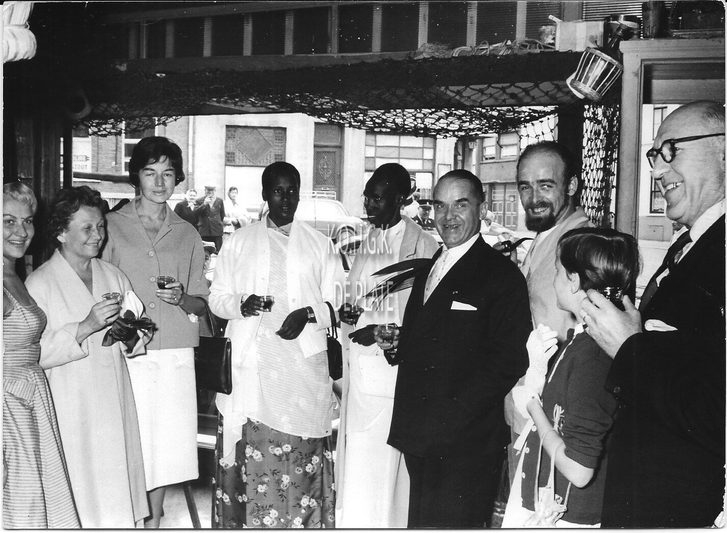 Formaat : 13 x 18 cm. - Tweede van links, mevrouw Van Glabbeke en naast haar Lucienne Porta, derde van links. Joris Houwen, derde van rechts, en naast hem, burgemeester Adolphe Van Glabbeke. De man rechts, Robert Elleboudt, uitgever van de Zeewacht. - Map 006 A-82