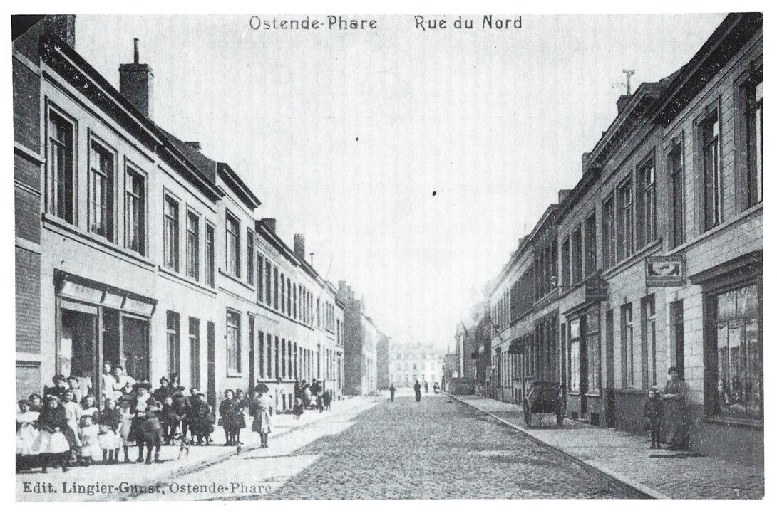 Ostende-Phare. Rue du Nord. Edit. Lingier-Gunst, Ostende-Phare. De Noordstraat, één van de vele straten die rond 1920 werden gesloopt voor de verdere bouw van de haven. De straat was gelegen tussen de Liefkemores- en de Avisostraat en werd aangelegd omstreeks 1900.
