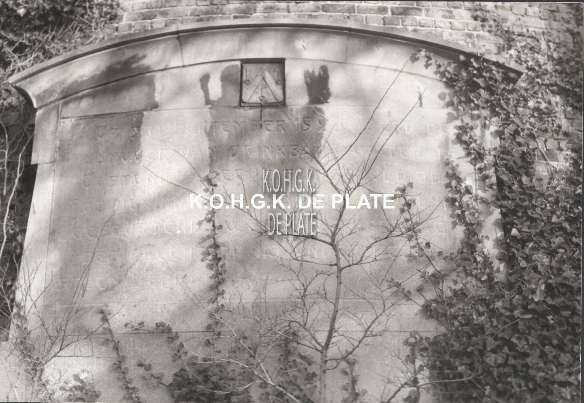 OP 23 SEPTEMBER 1923 WERD DE AANVOER VAN DRINKBAAR WATER TE OOSTENDE PLECHTIG INGEHULDIGD TER HERINNERING AAN DE HEUGLYKE GEBEURTENIS WERD HET VERSLAG DER PLECHTIGHEID IN DE VOET VAN DEZE STEEN INGEPLAND.