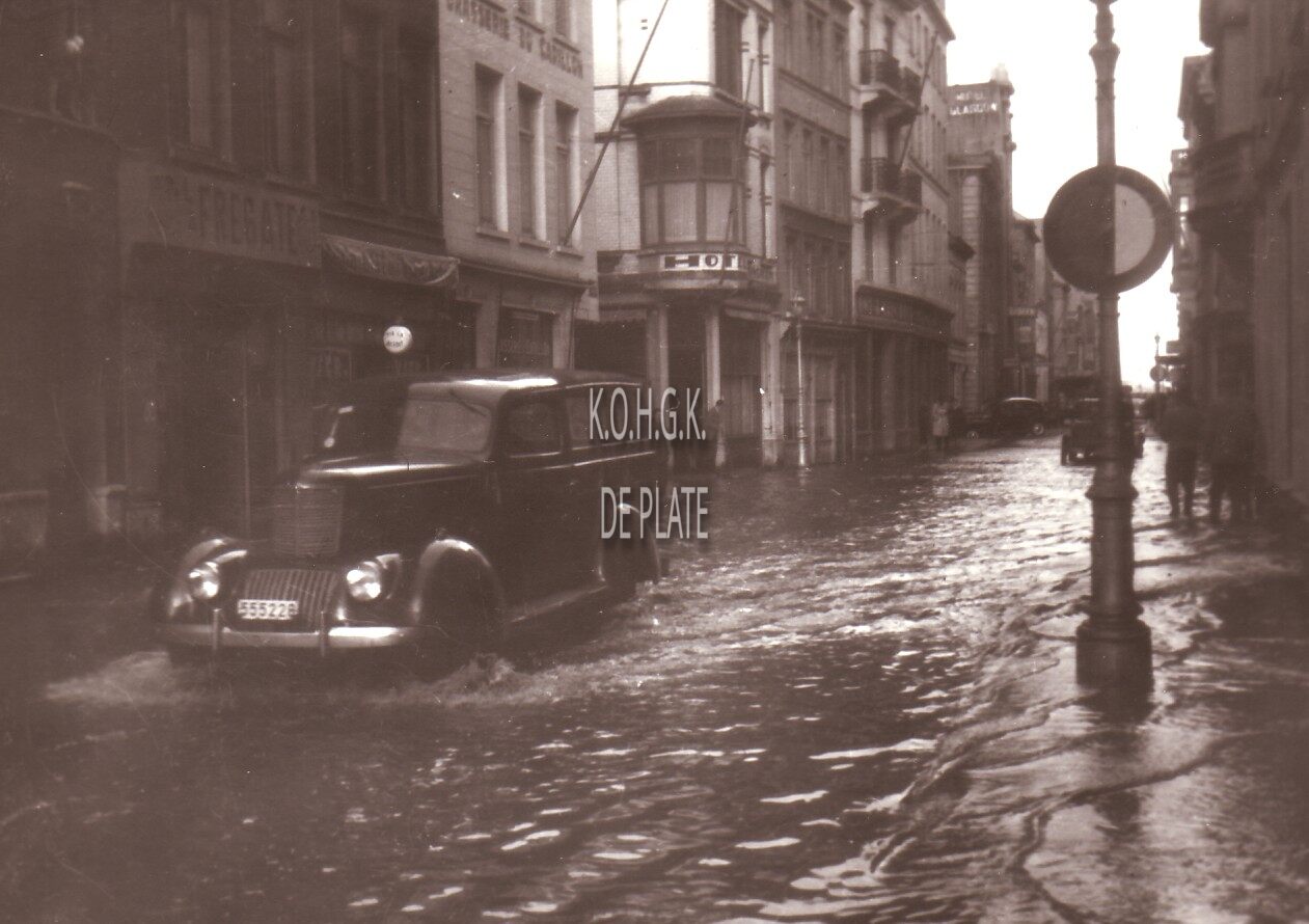 De Langestraat vanaf de hoek Louisastraat,richting Visserskaai onder water na voorjaarsstorm 1949.Links het achturenhuis.