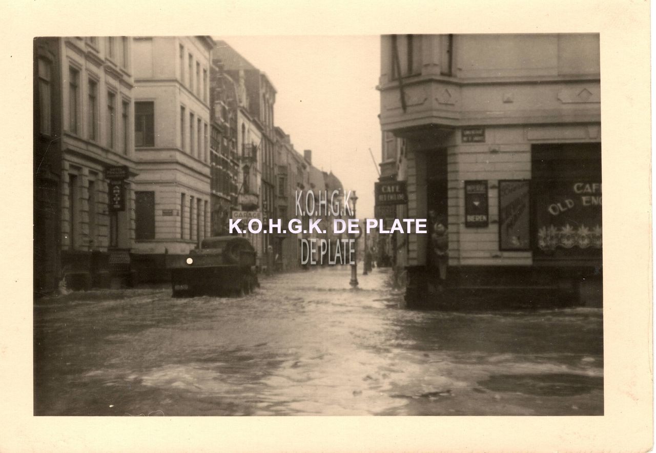 Formaat : 7,5 x 10,5 cm. - De Langestraat onder water na de storm van 01/03/1949. Op de hoek met de Londenstraat, café "Old England"