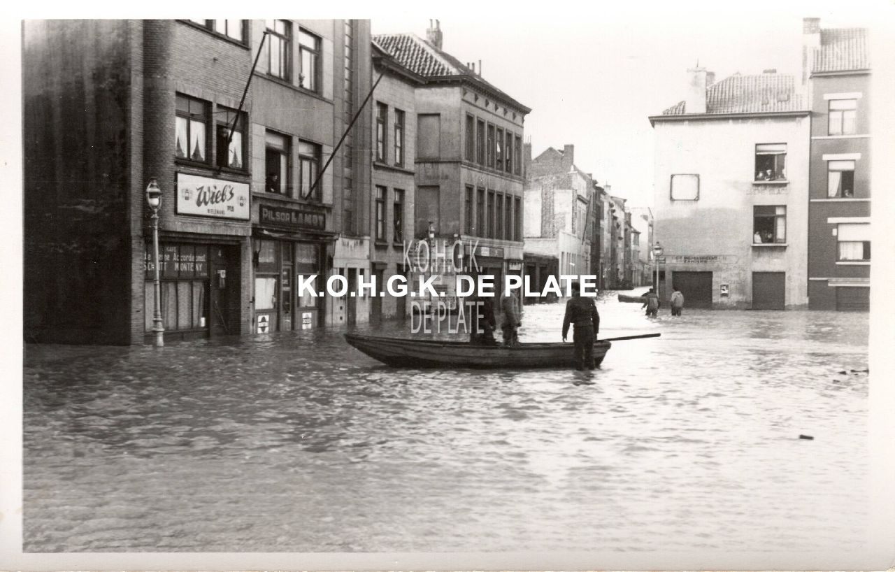 Formaat : 9 x 14 cm. - Vissersplein. Vooraan links : aanzet van Straat zonder Einde. Midden links : aanzet van Bonenstraat. Tussen de twee mannen staande op het bootje : aanzet Kadzandstraat en inkijk in de Schippersstraat.
