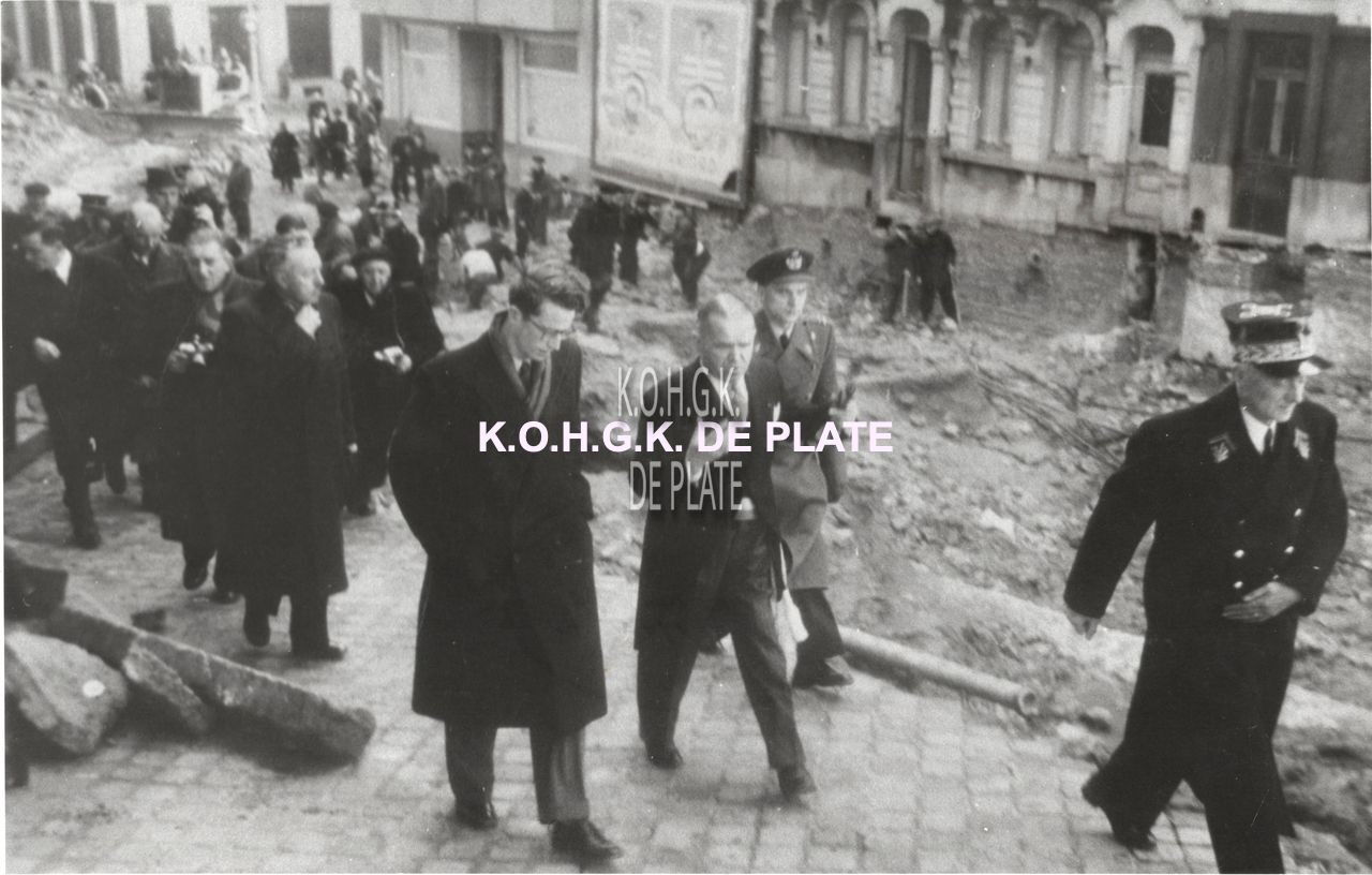 Formaat : 15,5 x 23,5 cm. - Op 3 februari 1953 bracht Koning Boudewijn een bezoek aan onze geteisterde stad. Hier in gesprek met burgemeester Adolf Van Glabbeke. Vooraan, hoofdpolitiecommissaris Emile Pintelon