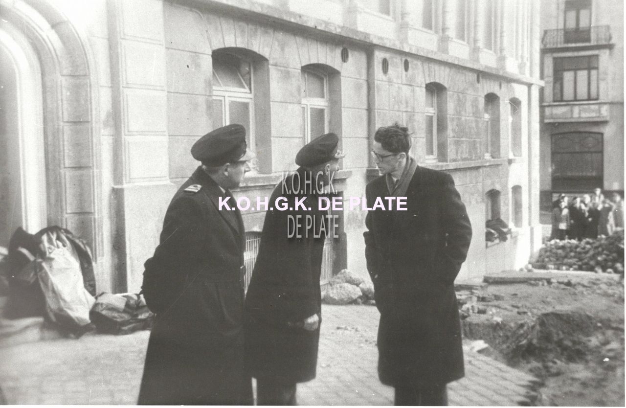 Formaat : 15,5 x 23,5 cm. - Op 3 februari 1953 bracht Koning Boudewijn een bezoek aan onze geteisterde stad. Hier in gesprek met ... (?)