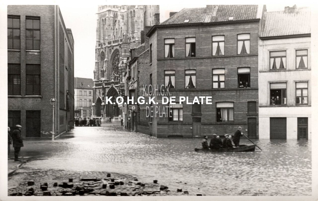Formaat : 14 x 9 cm. - Recht voor u, de Pastoor Pypestraat met op de achtergrond de Sint Petrus en Pauluskerk. Links en rechts de Sint Franciscustraat. Links de Vrije Visserijschool Paster Pype. In de werkplaats op het gelijkvloers steeg het water tot op 0,50 meter hoogte, met aanzienlijke schade