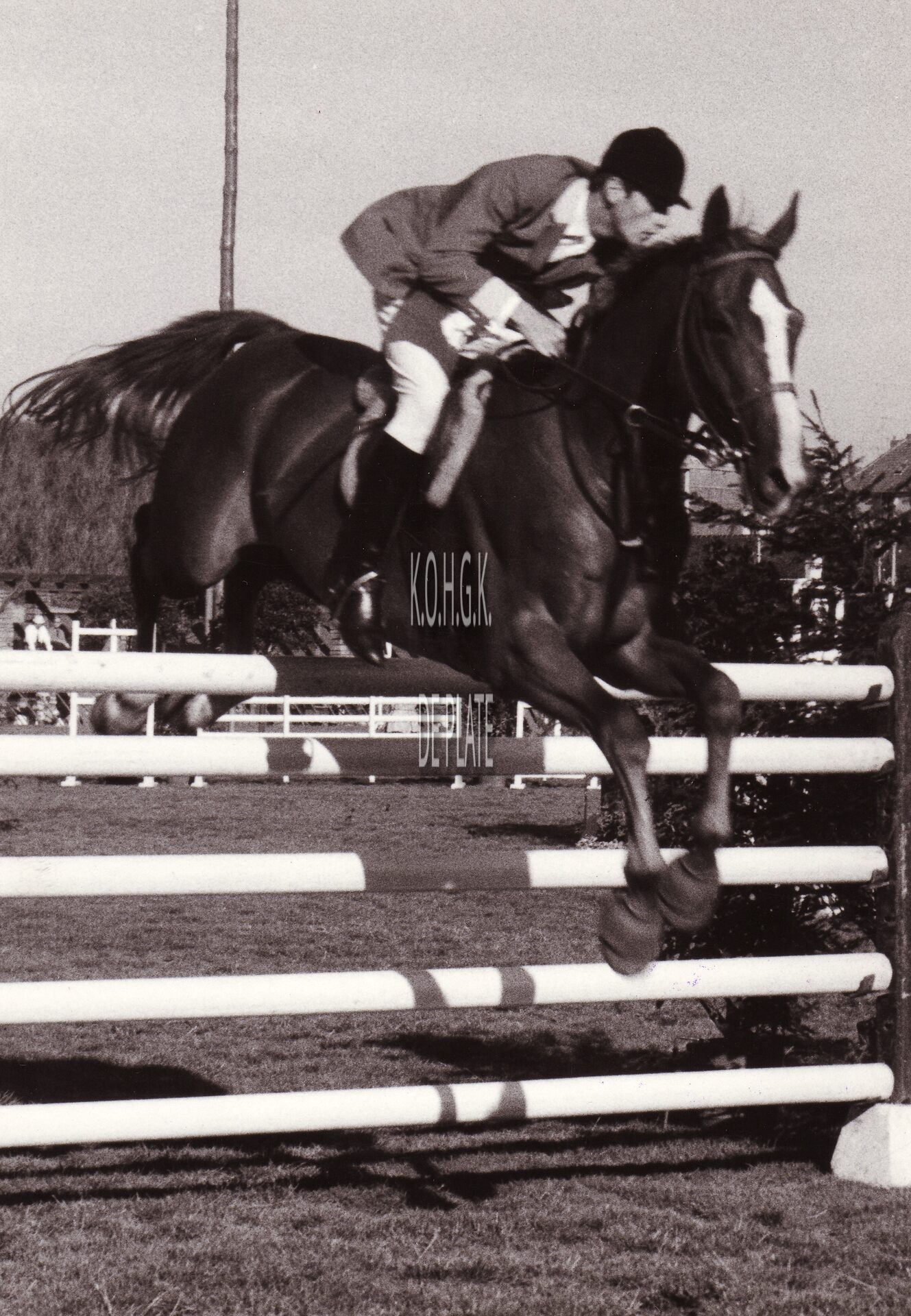 Formaat : 18 x 13 cm. - Ruiter Arthur Seynaeve gaat met zijn paard over een hindernis tijdens een springwedstrijd in het plantsoen van de Koninklijke Gaanderijen aan de Koningin Astridlaan.