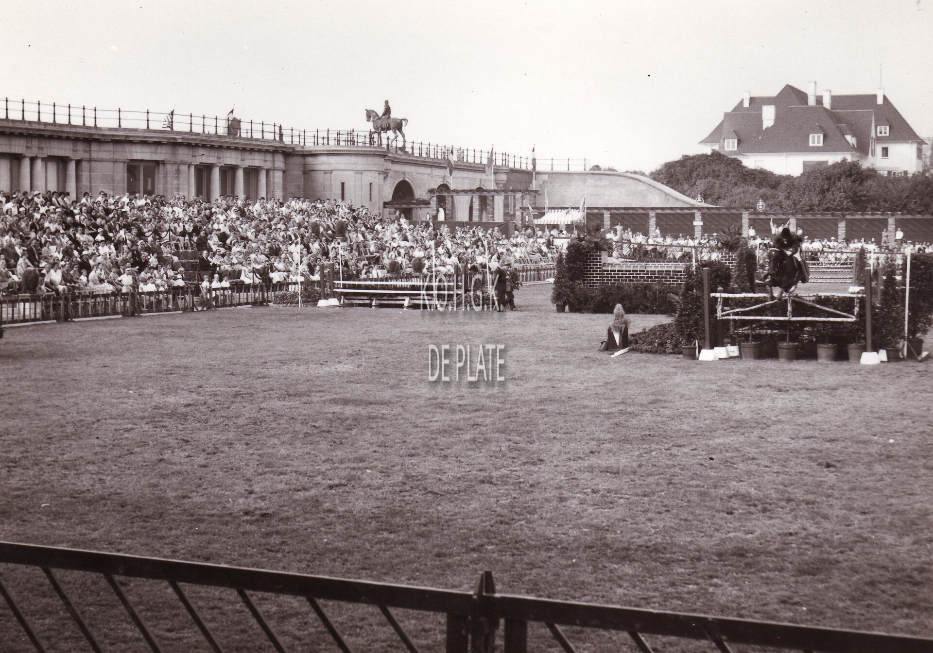 In de achtergrond rechts de koninklijke villa. In het midden de drie gapers met het ruiterstandbeeld van Leopold II