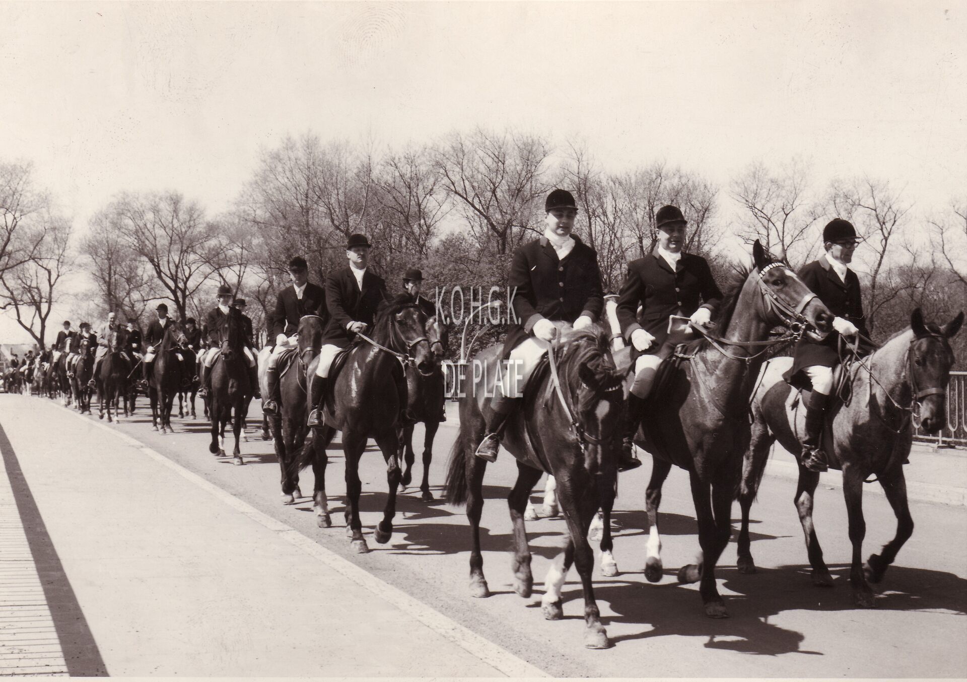 Formaat : 13 x 18 cm. - Deelnemende ruiters aan een jumpingwedstrijd in stoet in de Konginnelaan