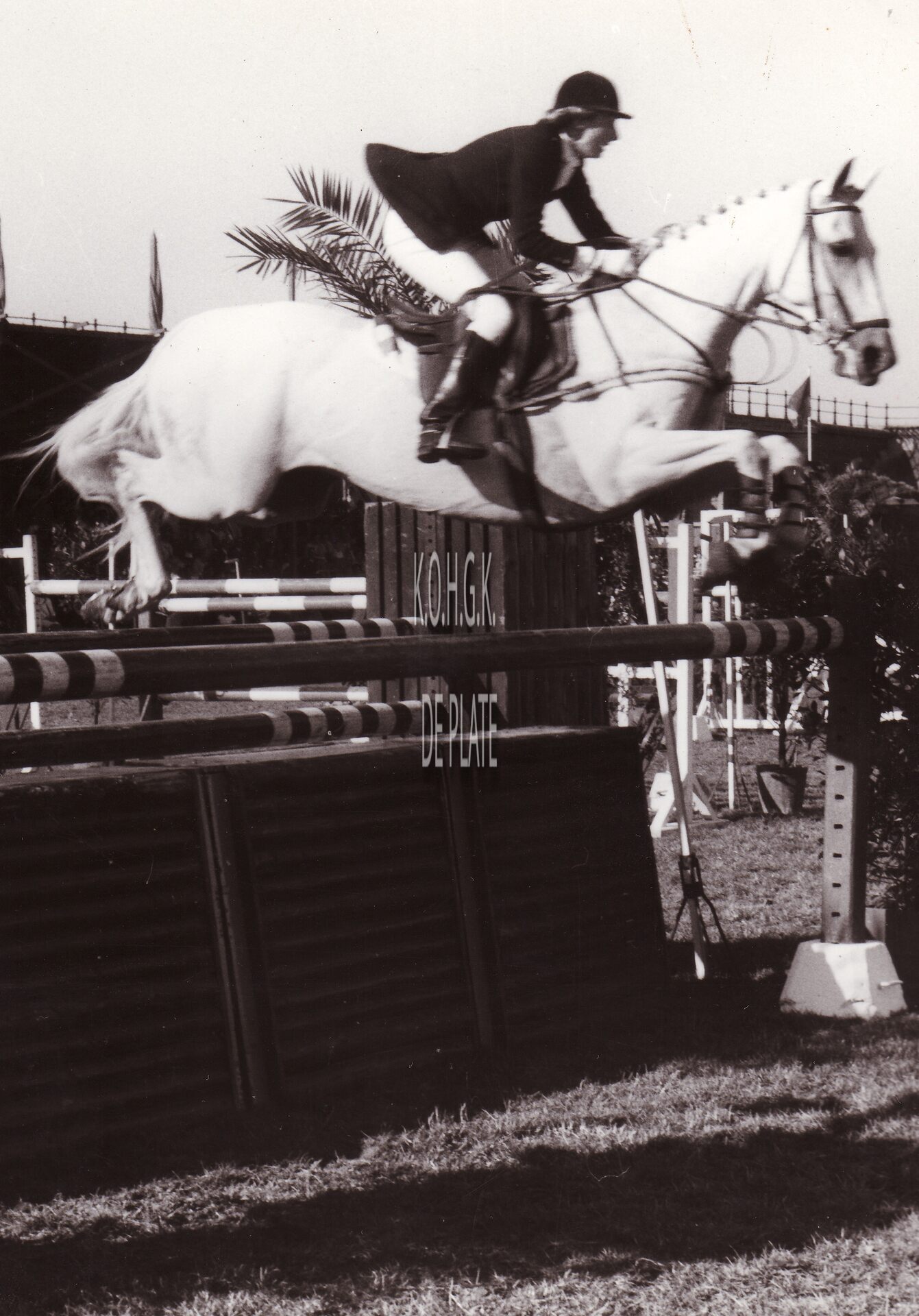Formaat : 18 x 13 cm. Een vrouwelijke ruiter en haar paard nemen deel aan de jumpingwedstrijd