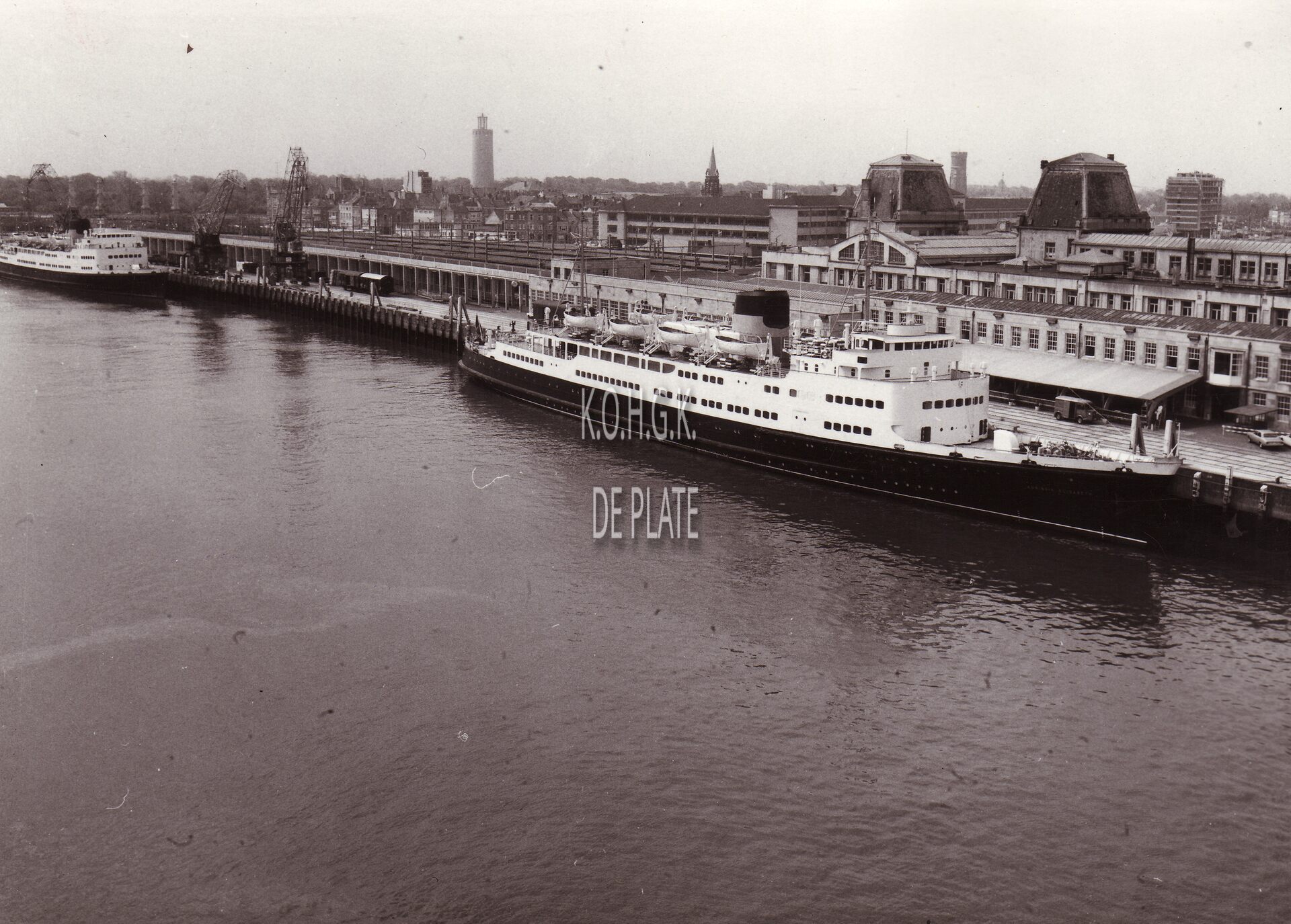 Formaat : 13 x 18 cm. - Pakketboot Koningin Elisabeth aangemeerd bij het Zeewezengebouw en inschepingshal aan de Natiënkaai. Op de achtergrond de wijk Hazegras.