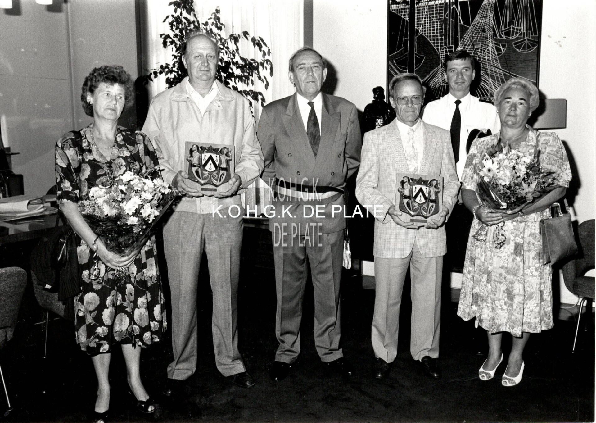 Formaat : 13 x 18 cm. - De brandweermannen werden met hun echtgenotes ontvangen op het stadhuis door burgemeester Goekint. De dames kregen een bloemetje, de mannen een plakkaat met het wapen van Oostende in keramiek op een houten ondergrond