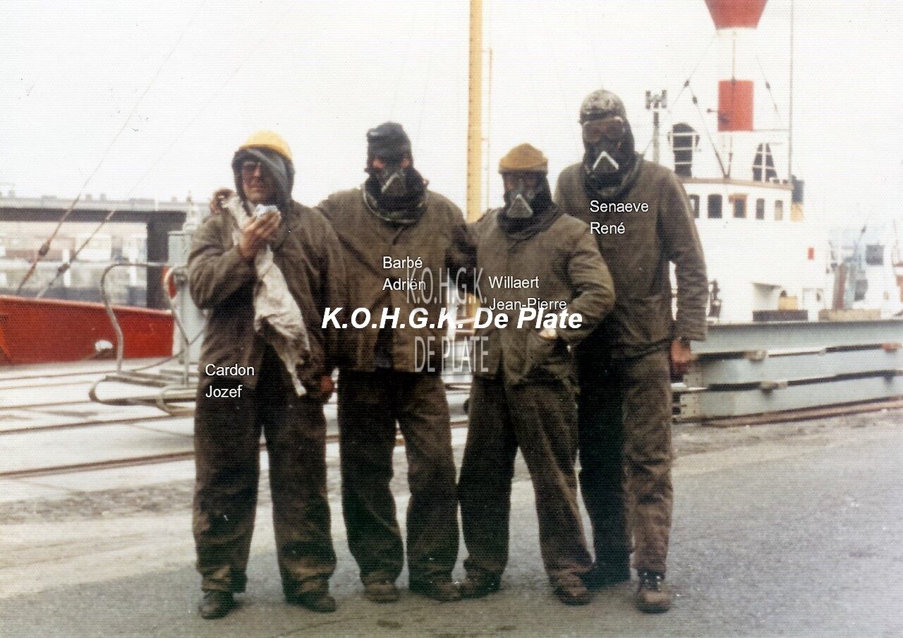 Afdruk, formaat : 29.5 x 21 cm. Verbouwing van Werkhuis "Smidse" naar Werkhuis "elektriekers". Van links naar rechts : Elektriekers Cardon Jozef, Barbé Adriën, Willaert Jean-Pierre en Senaeve René.