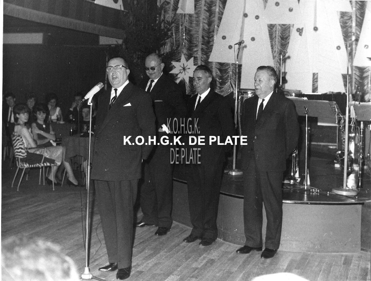 Formaat : 18 x 24 cm. - De nightclub "La Champagne". Schepen John Lauwereins houdt zijn toespraak. Van rechts naar links, de schepenen Jozef Van den Kieboom, Raymond Miroir en Roger De Ramée, directeur van de Kursaal.