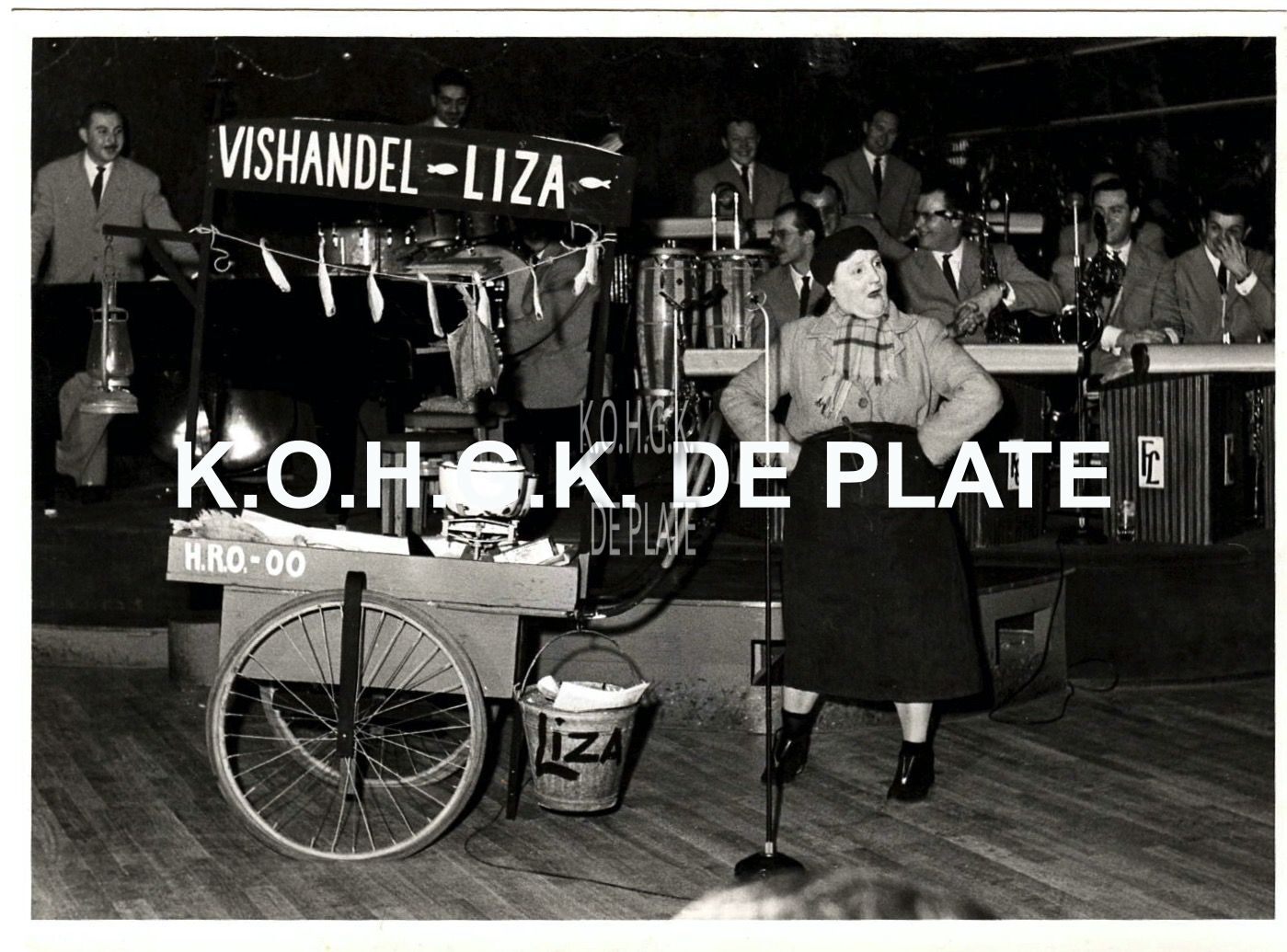 Formaat : 13 x 18 cm. - Irma Westerlinck. Zij trad samen op met Madeleine Vens. Op de achtergrond, het kursaalorkest van Franz Lebrun. Links, onze stadsgenoot, Roger Vanhaverbeke. Hij speelde contrabas in het orkest.