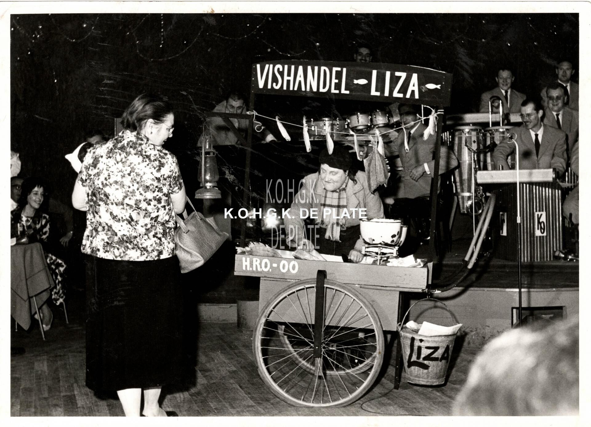 Formaat : 13 x 18 cm. - Irma Westerlinck en Madeleine Vens in een sketch. Op de achtergrond, het kursaalorkest van Franz Lebrun. Links, leunend op de piano, onze stadsgenoot Roger Vanhaverbeke. Hij speelde contrabas in het orkest.