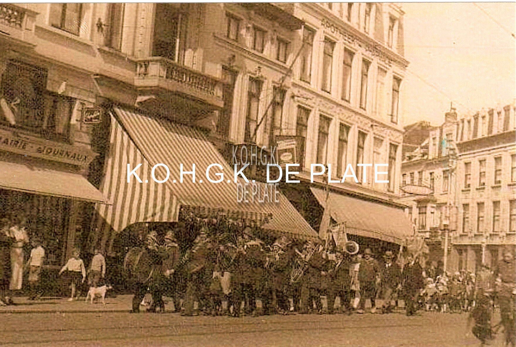 Afdruk. - Formaat : 10 x 15 cm. - De huizenrij langs de Nieuwpoortsesteenweg tussen de Koninginnelaan (links) en de Torhoutsesteenweg (rechts). Op de linkerhoek, een boekhandel, dan een groentewinkel, een tabakswinkel, en op de hoek met de Torhoutsesteenweg, apotheek Beuselinck. Waarschijnlijk een stoet