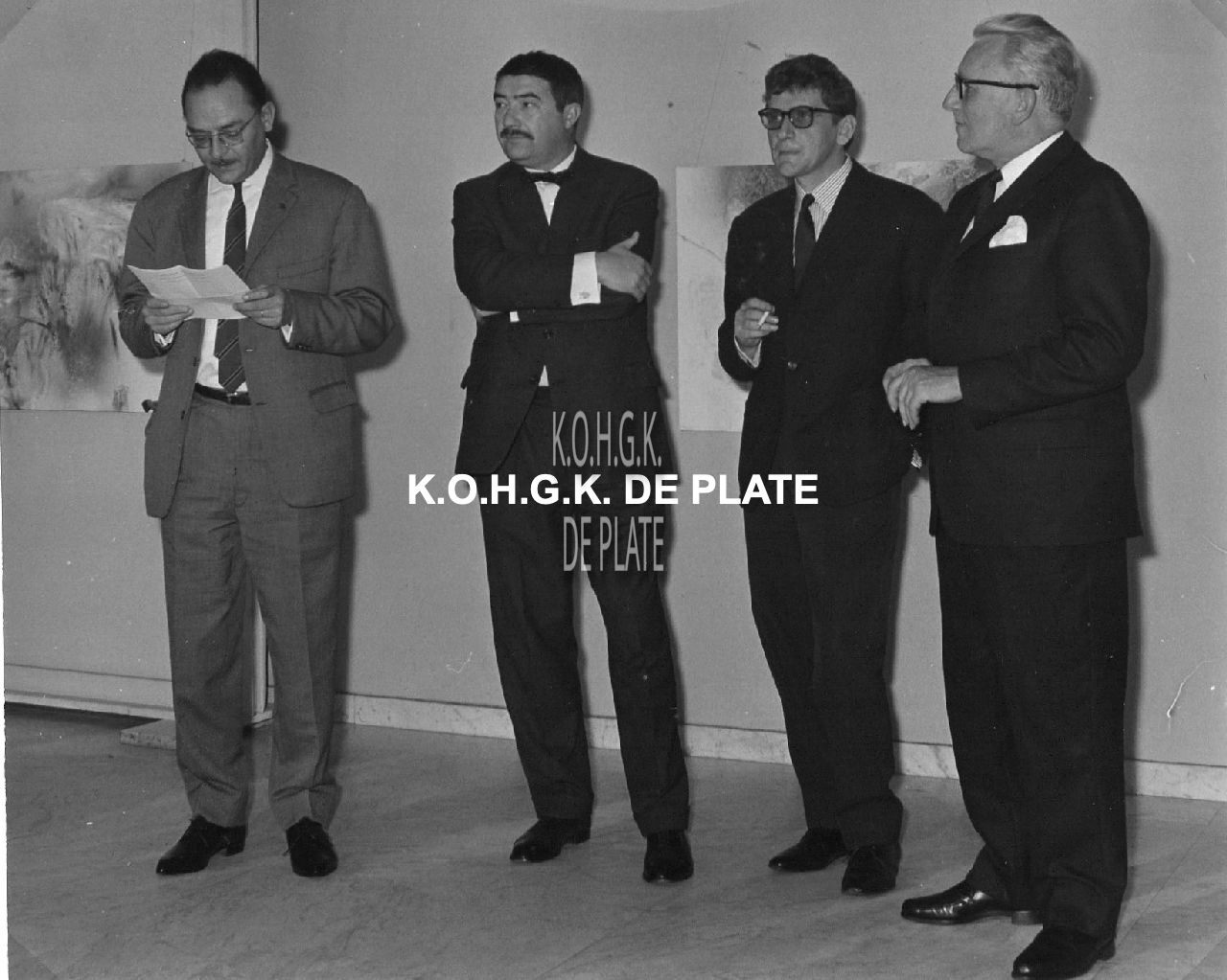 Formaat : 17 x 21 cm. - De vernissage. De kunstenaar, tweede van rechts, wordt ingeleid door Frank Edebau, stadsconservator, en naast hem schepen Roger De Kinder. De werken werden tentoongesteld in de Montrose- en leeszaal.
