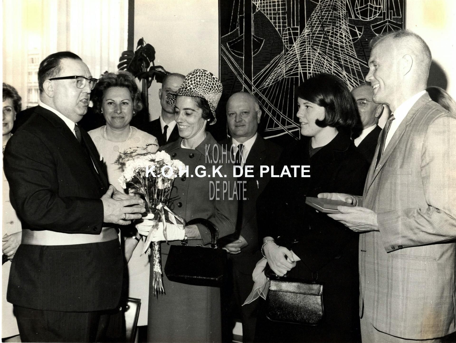 Formaat : 18 x 24 cm. - Ruimtevaarder John Glenn ontving de stadsmedaille uit de handen van John Lauwereins, waarnemend burgemeester. Naast hem, zijn dochter. Zijn echtgenote Anna Castor kreeg bloemen.