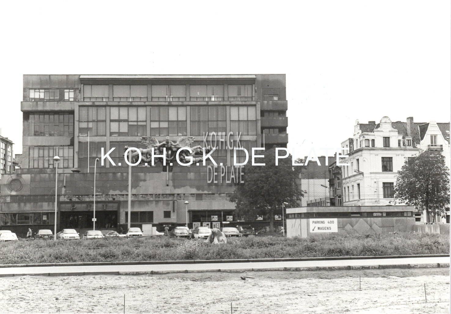 Formaat : 9 x 13 cm; - Postkantoor Hendrik Serruyslaan 18A. Centraal op front van hoofdgevel monumentaal beeldhouwwerk "De Communicatiemedia" of  "Eenheid van de wereld door de telefonie, telegrafie en postverkeer" (1953) van Jozef Cantré (Gent) in gedreven rood koper op metaalskelet vervaardigd door de firma Claudoré (Bergen). Compositie waarin centraal naakte gevleugelde godin waarin vier vrouwelijke figuren als representatie van de wereldrassen.