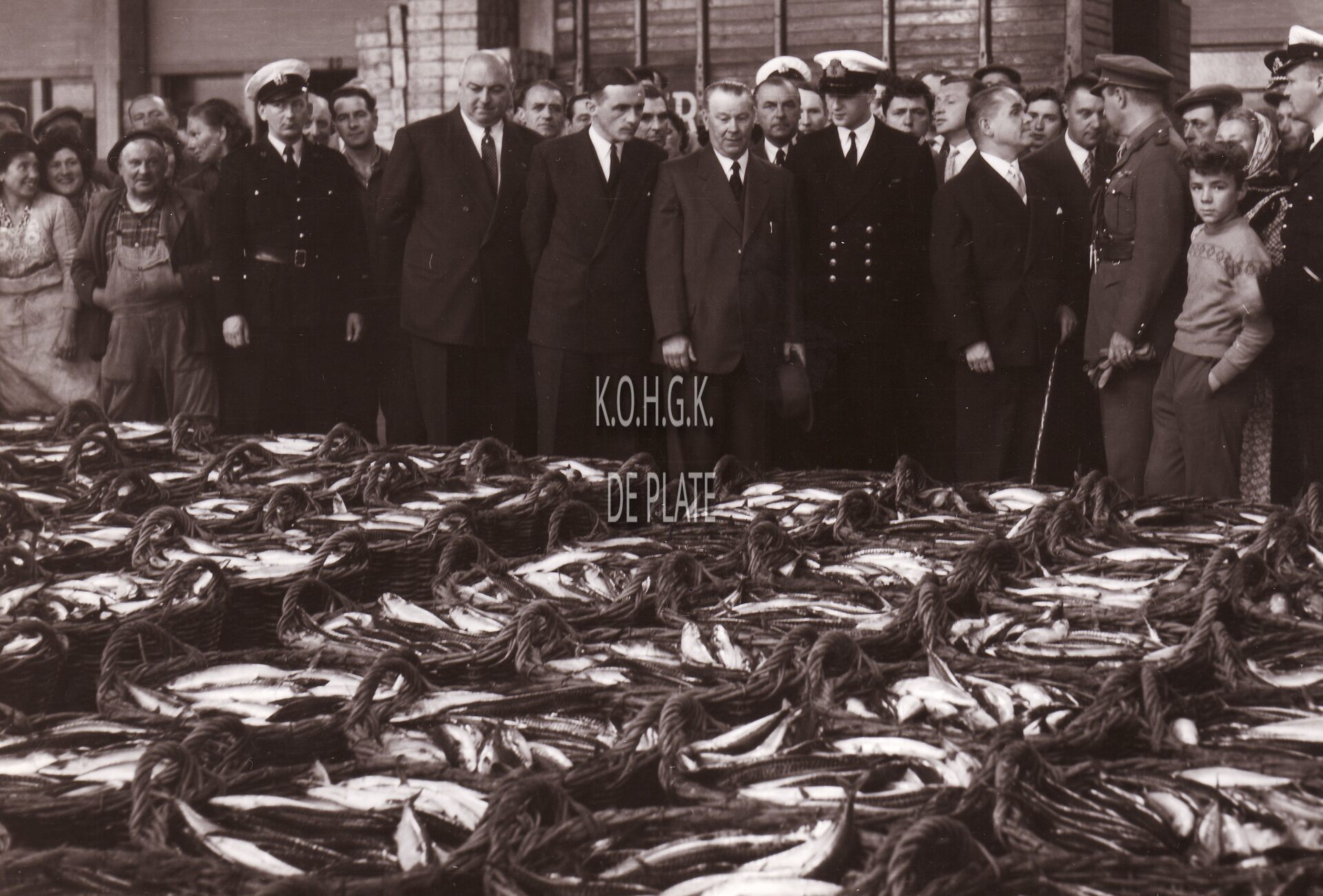 Formaat : 13 x 18 cm. - Rechts naast de prins, burgemeester Adolf Van Glabbeke. Links (tweede) van de prins provinciegoeverneur Pierre van Outryve d'Ydewalle en schepen Maurice Qauaghebeur sr. De prins krijgt uitleg van Gustave Velthof, directeur van de vissershaven
