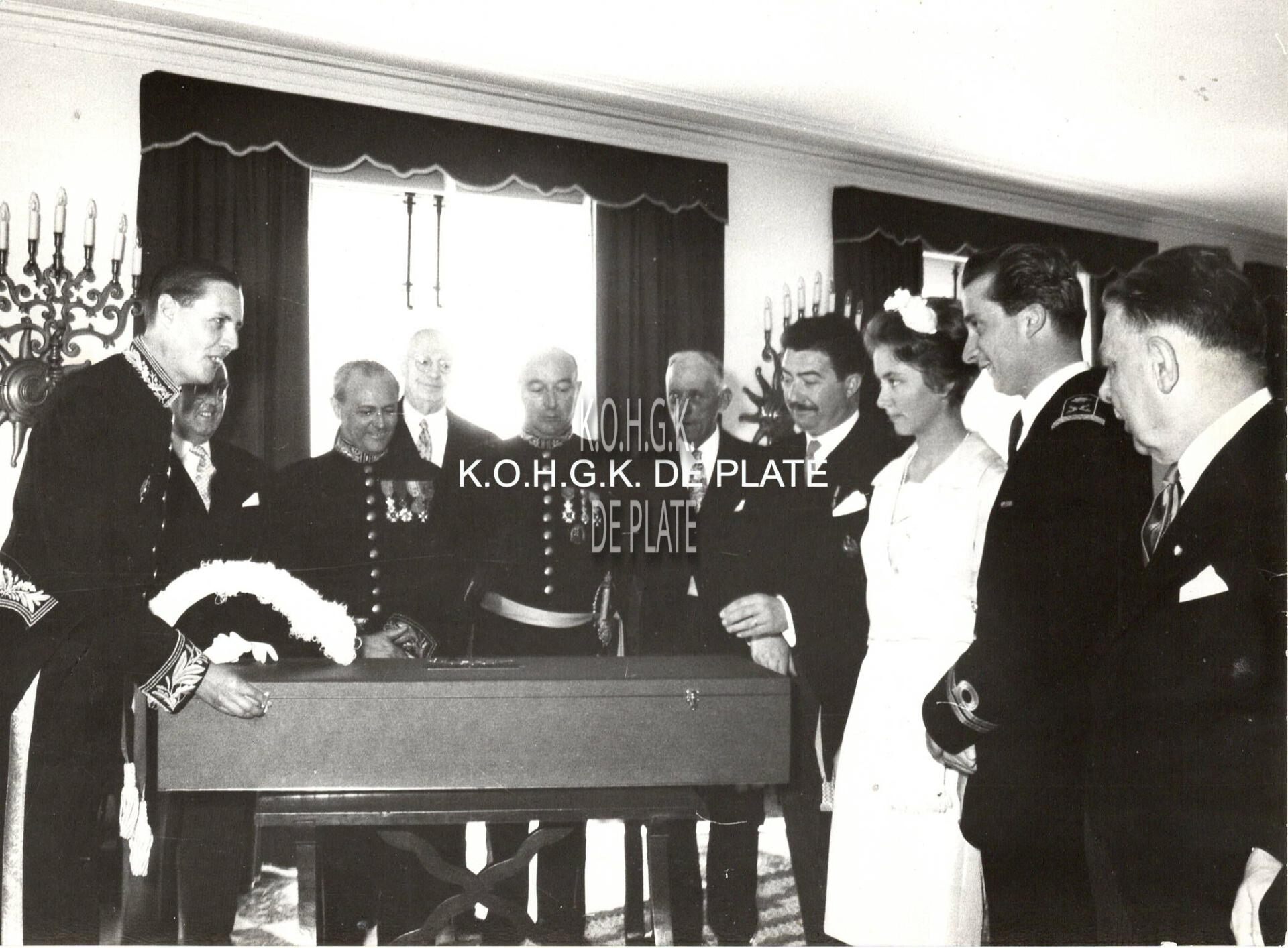 Formaat : 13 x 18 cm. - Burgemeester Piers overhandigt het huwelijksgeschenk aan prins Albert en prinses Paola tijdens hun blijde intrede in de Koninklijke Villa